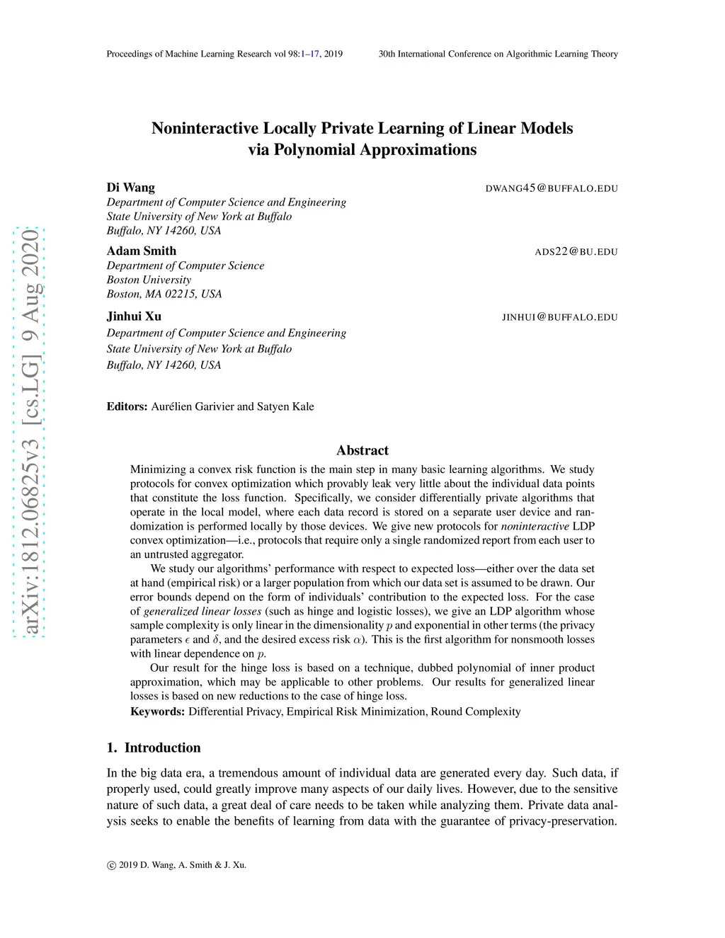 Noninteractive Locally Private Learning of Linear Models via Polynomial
