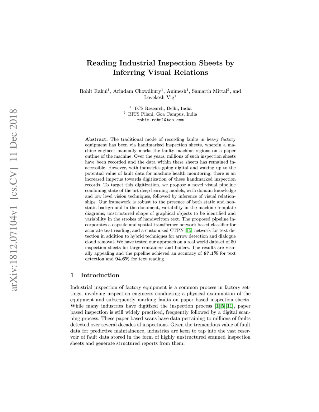 The traditional mode of recording faults in heavy factory equipment has been via hand marked inspection sheets, wherein a machine engineer manually marks the faulty machine regions on a paper outline of the machine. Over the years, millions of such inspection sheets have been recorded and the data within these sheets has remained inaccessible. However, with industries going digital and waking up to the potential value of fault data for machine health monitoring, there is an increased impetus towards digitization of these hand marked inspection records. To target this digitization, we propose a novel visual pipeline combining state of the art deep learning models, with domain knowledge and low level vision techniques, followed by inference of visual relationships. Our framework is robust to the presence of both static and non-static background in the document, variability in the machine template diagrams, unstructured shape of graphical objects to be identified and variability in the strokes of handwritten text. The proposed pipeline incorporates a capsule and spatial transformer network based classifier for accurate text reading, and a customized CTPN network for text detection in addition to hybrid techniques for arrow detection and dialogue cloud removal. We have tested our approach on a real world dataset of 50 inspection sheets for large containers and boilers. The results are visually appealing and the pipeline achieved an accuracy of 87.1% for text detection and 94.6% for text reading.