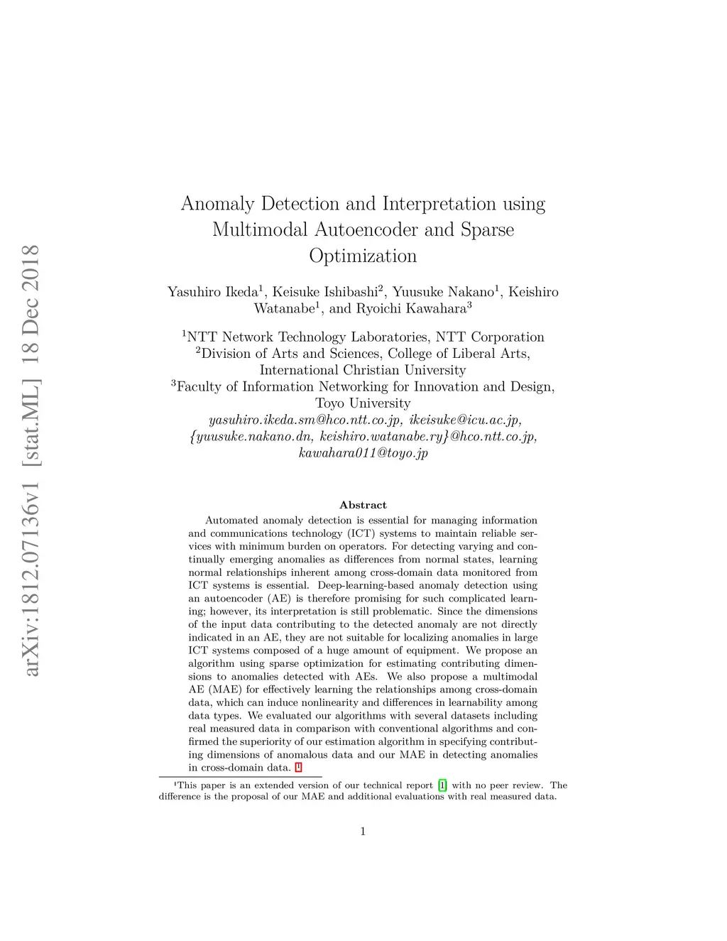 Automated anomaly detection is essential for managing information and communications technology (ICT) systems to maintain reliable services with minimum burden on operators. For detecting varying and continually emerging anomalies as differences from normal states, learning normal relationships inherent among cross-domain data monitored from ICT systems is essential. Deep-learning-based anomaly detection using an autoencoder (AE) is therefore promising for such complicated learning; however, its interpretation is still problematic. Since the dimensions of the input data contributing to the detected anomaly are not directly indicated in an AE, they are not suitable for localizing anomalies in large ICT systems composed of a huge amount of equipment. We propose an algorithm using sparse optimization for estimating contributing dimensions to anomalies detected with AEs. We also propose a multimodal AE (MAE) for effectively learning the relationships among cross-domain data, which can induce nonlinearity and differences in learnability among data types. We evaluated our algorithms with several datasets including real measured data in comparison with conventional algorithms and confirmed the superiority of our estimation algorithm in specifying contributing dimensions of anomalous data and our MAE in detecting anomalies in cross-domain data.