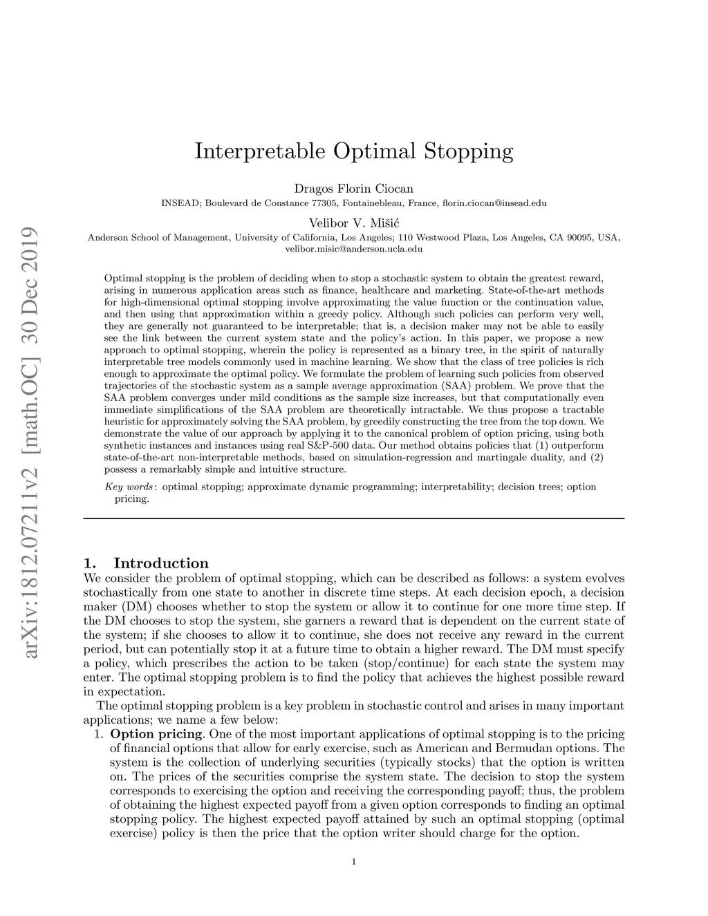 Optimal stopping is the problem of deciding when to stop a stochastic system to obtain the greatest reward, arising in numerous application areas such as finance, healthcare and marketing. State-of-the-art methods for high-dimensional optimal stopping involve approximating the value function or the continuation value, and then using that approximation within a greedy policy. Although such policies can perform very well, they are generally not guaranteed to be interpretable; that is, a decision maker may not be able to easily see the link between the current system state and the policy's action. In this paper, we propose a new approach to optimal stopping, wherein the policy is represented as a binary tree, in the spirit of naturally interpretable tree models commonly used in machine learning. We show that the class of tree policies is rich enough to approximate the optimal policy. We formulate the problem of learning such policies from observed trajectories of the stochastic system as a sample average approximation (SAA) problem. We prove that the SAA problem converges under mild conditions as the sample size increases, but that computationally even immediate simplifications of the SAA problem are theoretically intractable. We thus propose a tractable heuristic for approximately solving the SAA problem, by greedily constructing the tree from the top down. We demonstrate the value of our approach by applying it to the canonical problem of option pricing, using both synthetic instances and instances using real S&P-500 data. Our method obtains policies that (1) outperform state-of-the-art non-interpretable methods, based on simulation-regression and martingale duality, and (2) possess a remarkably simple and intuitive structure.