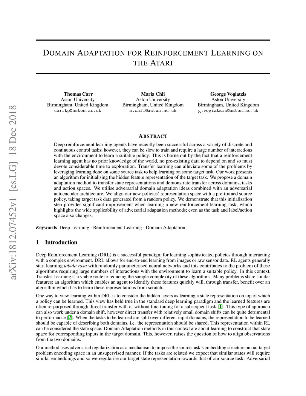 Domain Adaptation for Reinforcement Learning on the Atari