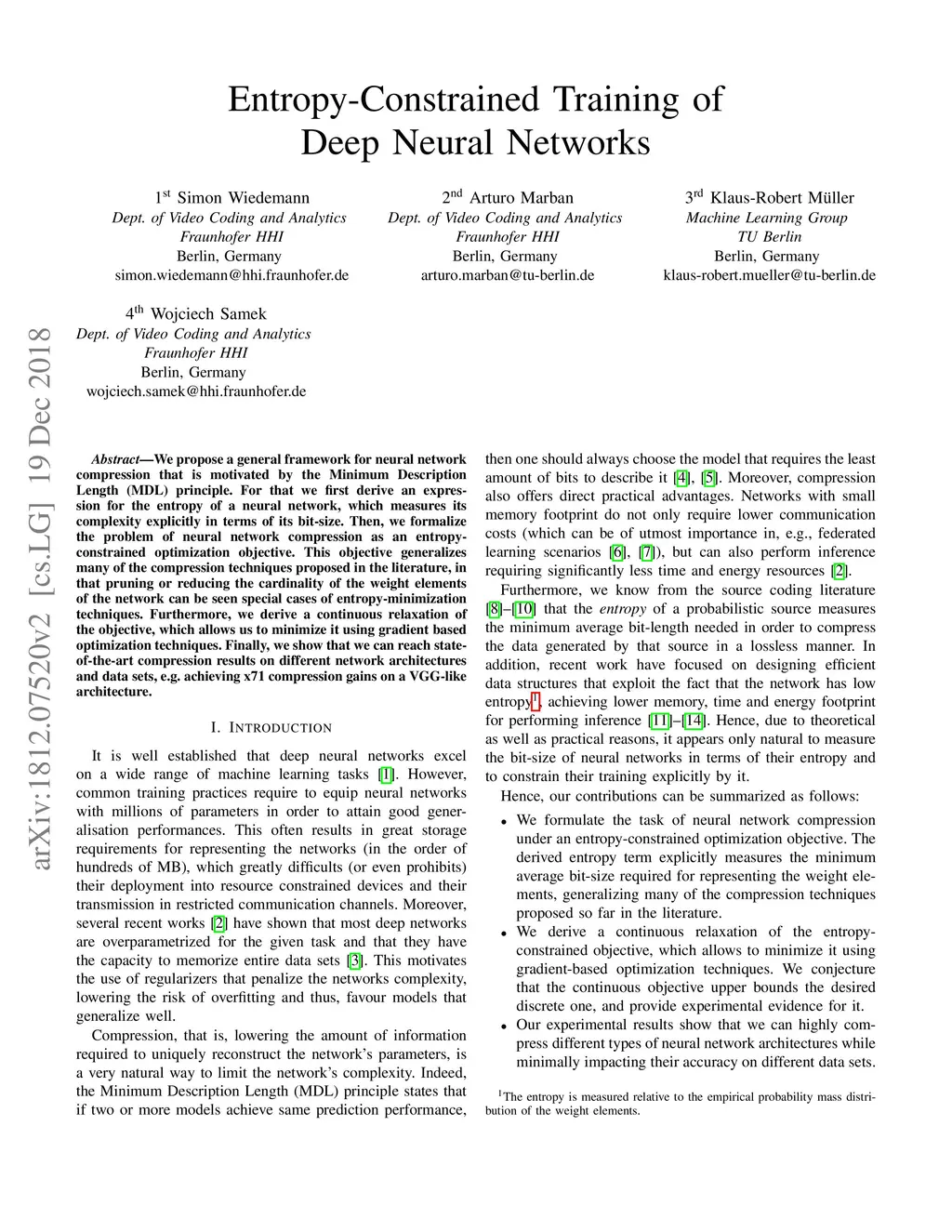 We propose a general framework for neural network compression that is motivated by the Minimum Description Length (MDL) principle. For that we first derive an expression for the entropy of a neural network, which measures its complexity explicitly in terms of its bit-size. Then, we formalize the problem of neural network compression as an entropy-constrained optimization objective. This objective generalizes many of the compression techniques proposed in the literature, in that pruning or reducing the cardinality of the weight elements of the network can be seen special cases of entropy-minimization techniques. Furthermore, we derive a continuous relaxation of the objective, which allows us to minimize it using gradient based optimization techniques. Finally, we show that we can reach state-of-the-art compression results on different network architectures and data sets, e.g. achieving x71 compression gains on a VGG-like architecture.