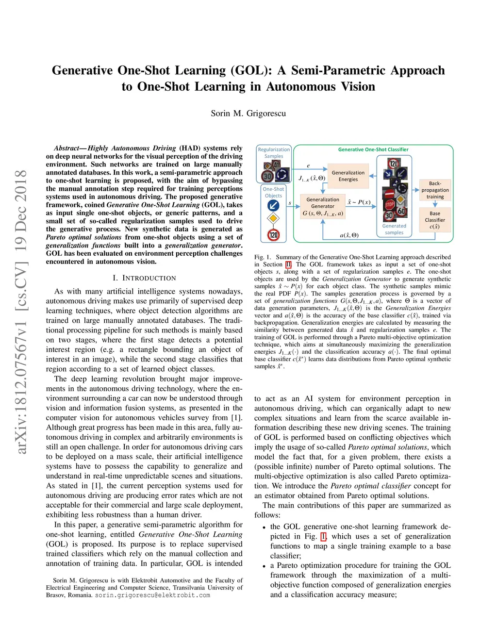 Highly Autonomous Driving (HAD) systems rely on deep neural networks for the visual perception of the driving environment. Such networks are trained on large manually annotated databases. In this work, a semi-parametric approach to one-shot learning is proposed, with the aim of bypassing the manual annotation step required for training perceptions systems used in autonomous driving. The proposed generative framework, coined Generative One-Shot Learning (GOL), takes as input single one-shot objects, or generic patterns, and a small set of so-called regularization samples used to drive the generative process. New synthetic data is generated as Pareto optimal solutions from one-shot objects using a set of generalization functions built into a generalization generator. GOL has been evaluated on environment perception challenges encountered in autonomous vision.