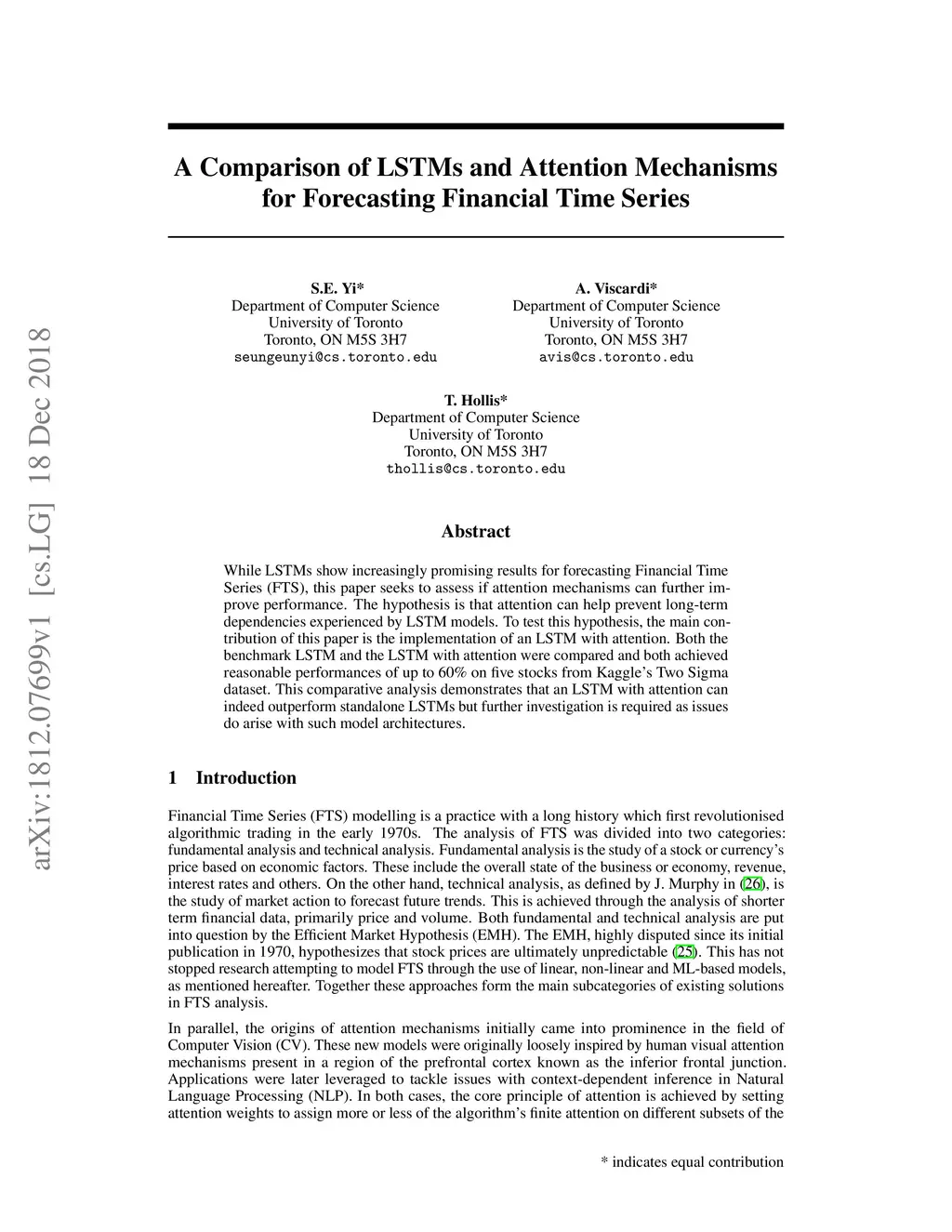 While LSTMs show increasingly promising results for forecasting Financial Time Series (FTS), this paper seeks to assess if attention mechanisms can further improve performance. The hypothesis is that attention can help prevent long-term dependencies experienced by LSTM models. To test this hypothesis, the main contribution of this paper is the implementation of an LSTM with attention. Both the benchmark LSTM and the LSTM with attention were compared and both achieved reasonable performances of up to 60% on five stocks from Kaggle's Two Sigma dataset. This comparative analysis demonstrates that an LSTM with attention can indeed outperform standalone LSTMs but further investigation is required as issues do arise with such model architectures.