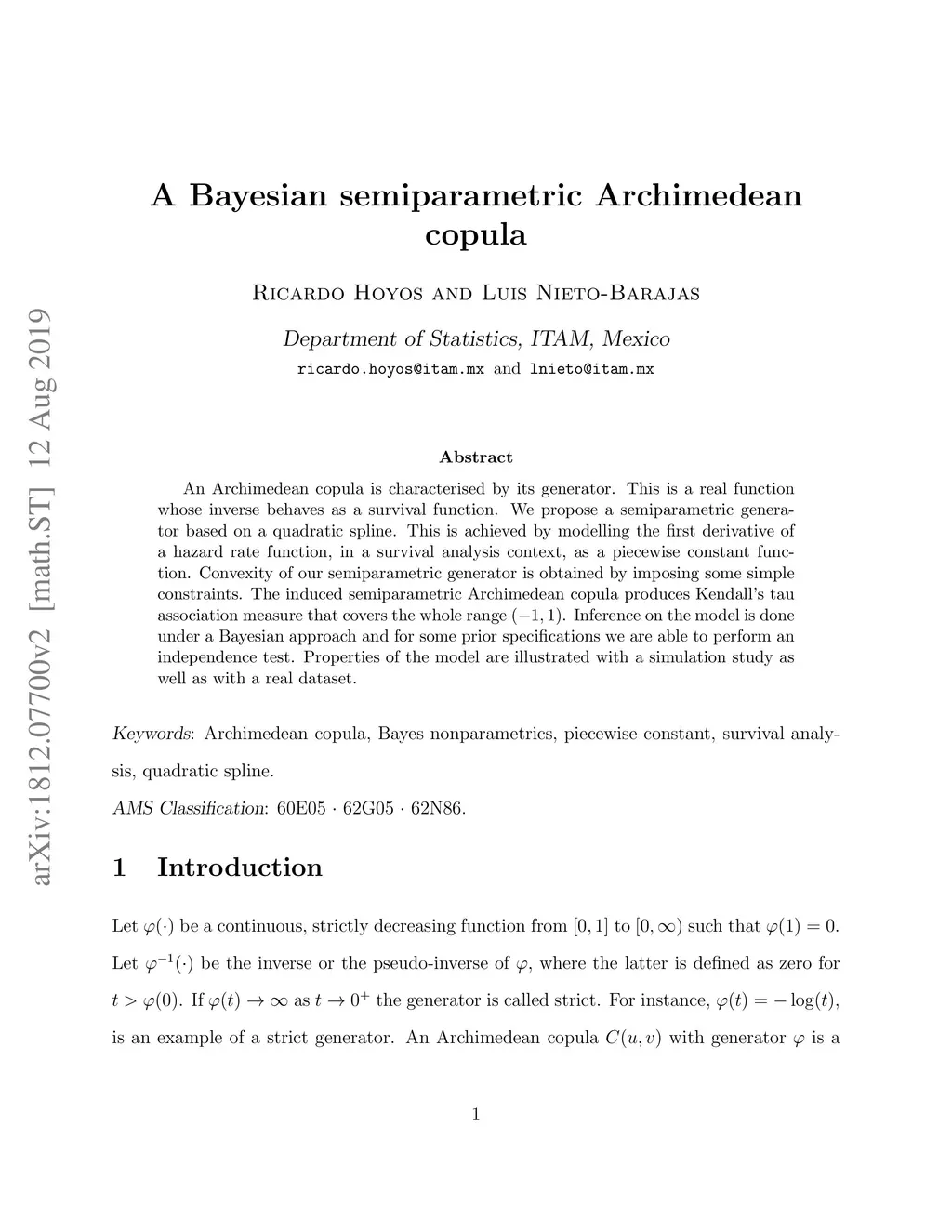 An Archimedean copula is characterised by its generator. This is a real function whose inverse behaves as a survival function. We propose a semiparametric generator based on a quadratic spline. This is achieved by modelling the first derivative of a hazard rate function, in a survival analysis context, as a piecewise constant function. Convexity of our semiparametric generator is obtained by imposing some simple constraints. The induced semiparametric Archimedean copula produces Kendall's tau association measure that covers the whole range . Inference on the model is done under a Bayesian approach and for some prior specifications we are able to perform an independence test. Properties of the model are illustrated with a simulation study as well as with a real dataset.