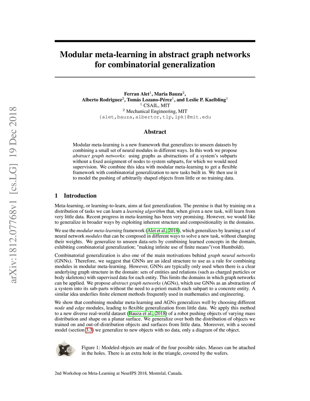 Modular meta-learning is a new framework that generalizes to unseen datasets by combining a small set of neural modules in different ways. In this work we propose abstract graph networks: using graphs as abstractions of a system's subparts without a fixed assignment of nodes to system subparts, for which we would need supervision. We combine this idea with modular meta-learning to get a flexible framework with combinatorial generalization to new tasks built in. We then use it to model the pushing of arbitrarily shaped objects from little or no training data.