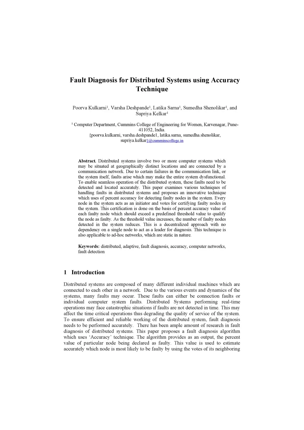 Distributed Systems involve two or more computer systems which may be situated at geographically distinct locations and are connected by a communication network. Due to failures in the communication link, faults arise which may make the entire system dysfunctional. To enable seamless operation of the distributed system, these faults need to be detected and located accurately. This paper examines various techniques of handling faults in distributed systems and proposes and innovative technique which uses percent accuracy for detecting faulty nodes in the system. Every node in the system acts as an initiator and votes for certifying faulty nodes in the system. This certification is done on the basis of percent accuracy value of each faulty node which should exceed a predefined threshold value to qualify node as faulty. As the threshold increases, the number of faulty nodes detected in the system reduces. This is a decentralized approach with no dependency on a single node to act as a leader for diagnosis. This technique is also applicable to ad-hoc networks, which are static in nature.