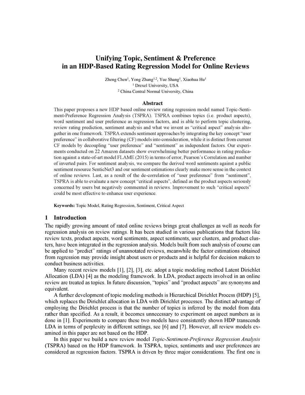 This paper proposes a new HDP based online review rating regression model named Topic-Sentiment-Preference Regression Analysis (TSPRA). TSPRA combines topics (i.e. product aspects), word sentiment and user preference as regression factors, and is able to perform topic clustering, review rating prediction, sentiment analysis and what we invent as "critical aspect" analysis altogether in one framework. TSPRA extends sentiment approaches by integrating the key concept "user preference" in collaborative filtering (CF) models into consideration, while it is distinct from current CF models by decoupling "user preference" and "sentiment" as independent factors. Our experiments conducted on 22 Amazon datasets show overwhelming better performance in rating predication against a state-of-art model FLAME (2015) in terms of error, Pearson's Correlation and number of inverted pairs. For sentiment analysis, we compare the derived word sentiments against a public sentiment resource SenticNet3 and our sentiment estimations clearly make more sense in the context of online reviews. Last, as a result of the de-correlation of "user preference" from "sentiment", TSPRA is able to evaluate a new concept "critical aspects", defined as the product aspects seriously concerned by users but negatively commented in reviews. Improvement to such "critical aspects" could be most effective to enhance user experience.