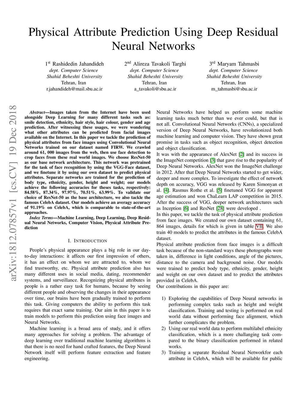 Images taken from the Internet have been used alongside Deep Learning for many different tasks such as: smile detection, ethnicity, hair style, hair colour, gender and age prediction. After witnessing these usages, we were wondering what other attributes can be predicted from facial images available on the Internet. In this paper we tackle the prediction of physical attributes from face images using Convolutional Neural Networks trained on our dataset named FIRW. We crawled around 61, 000 images from the web, then use face detection to crop faces from these real world images. We choose ResNet-50 as our base network architecture. This network was pretrained for the task of face recognition by using the VGG-Face dataset, and we finetune it by using our own dataset to predict physical attributes. Separate networks are trained for the prediction of body type, ethnicity, gender, height and weight; our models achieve the following accuracies for theses tasks, respectively: 84.58%, 87.34%, 97.97%, 70.51%, 63.99%. To validate our choice of ResNet-50 as the base architecture, we also tackle the famous CelebA dataset. Our models achieve an averagy accuracy of 91.19% on CelebA, which is comparable to state-of-the-art approaches.