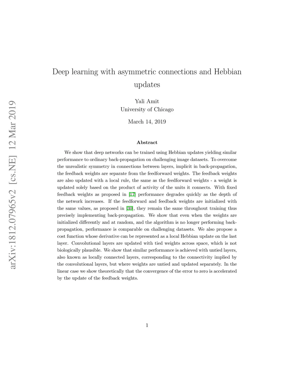 We show that deep networks can be trained using Hebbian updates yielding similar performance to ordinary back-propagation on challenging image datasets. To overcome the unrealistic symmetry in connections between layers, implicit in back-propagation, the feedback weights are separate from the feedforward weights. The feedback weights are also updated with a local rule, the same as the feedforward weights - a weight is updated solely based on the product of activity of the units it connects. With fixed feedback weights as proposed in Lillicrap et. al (2016) performance degrades quickly as the depth of the network increases. If the feedforward and feedback weights are initialized with the same values, as proposed in Zipser and Rumelhart (1990), they remain the same throughout training thus precisely implementing back-propagation. We show that even when the weights are initialized differently and at random, and the algorithm is no longer performing back-propagation, performance is comparable on challenging datasets. We also propose a cost function whose derivative can be represented as a local Hebbian update on the last layer. Convolutional layers are updated with tied weights across space, which is not biologically plausible. We show that similar performance is achieved with untied layers, also known as locally connected layers, corresponding to the connectivity implied by the convolutional layers, but where weights are untied and updated separately. In the linear case we show theoretically that the convergence of the error to zero is accelerated by the update of the feedback weights.