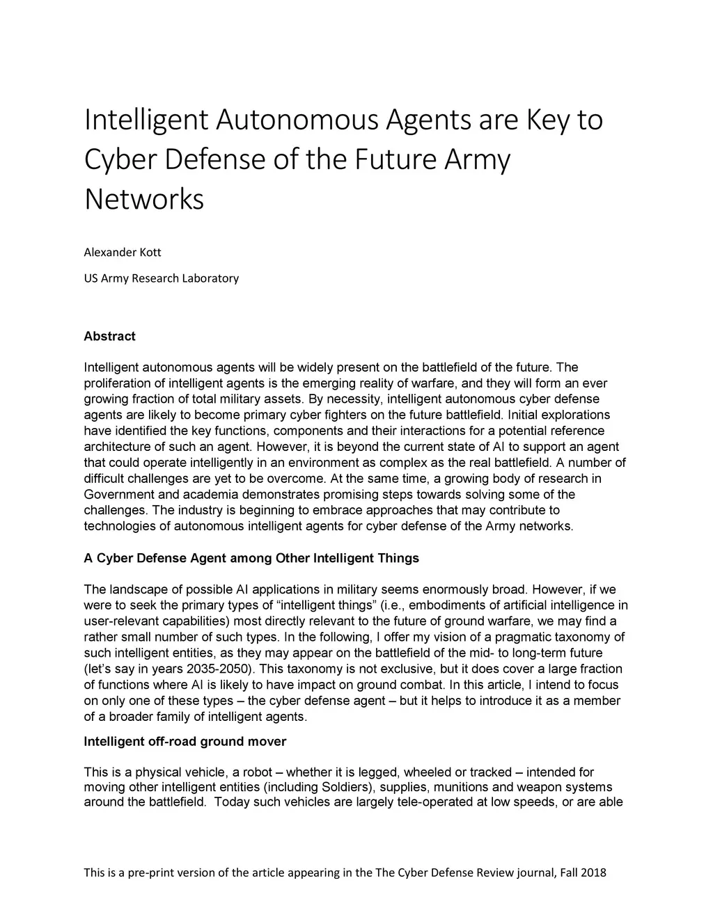 Intelligent autonomous agents will be widely present on the battlefield of the future. The proliferation of intelligent agents is the emerging reality of warfare, and they will form an ever growing fraction of total military assets. By necessity, intelligent autonomous cyber defense agents are likely to become primary cyber fighters on the future battlefield. Initial explorations have identified the key functions, components and their interactions for a potential reference architecture of such an agent. However, it is beyond the current state of AI to support an agent that could operate intelligently in an environment as complex as the real battlefield. A number of difficult challenges are yet to be overcome. At the same time, a growing body of research in Government and academia demonstrates promising steps towards solving some of the challenges. The industry is beginning to embrace approaches that may contribute to technologies of autonomous intelligent agents for cyber defense of the Army networks.