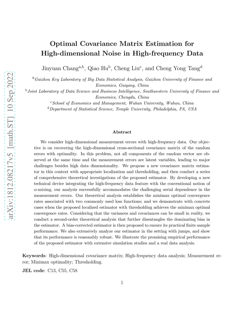 We consider high-dimensional measurement errors with high-frequency data. Our objective is on recovering the high-dimensional cross-sectional covariance matrix of the random errors with optimality. In this problem, not all components of the random vector are observed at the same time and the measurement errors are latent variables, leading to major challenges besides high data dimensionality. We propose a new covariance matrix estimator in this context with appropriate localization and thresholding, and then conduct a series of comprehensive theoretical investigations of the proposed estimator. By developing a new technical device integrating the high-frequency data feature with the conventional notion of α\alpha-mixing, our analysis successfully accommodates the challenging serial dependence in the measurement errors. Our theoretical analysis establishes the minimax optimal convergence rates associated with two commonly used loss functions; and we demonstrate with concrete cases when the proposed localized estimator with thresholding achieves the minimax optimal convergence rates. Considering that the variances and covariances can be small in reality, we conduct a second-order theoretical analysis that further disentangles the dominating bias in the estimator. A bias-corrected estimator is then proposed to ensure its practical finite sample performance. We also extensively analyze our estimator in the setting with jumps, and show that its performance is reasonably robust. We illustrate the promising empirical performance of the proposed estimator with extensive simulation studies and a real data analysis.
