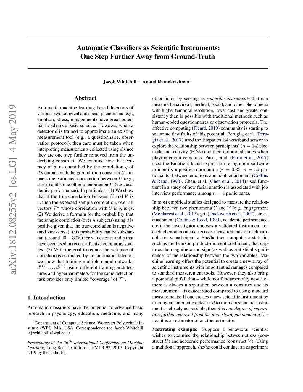 Automatic machine learning-based detectors of various psychological and social phenomena (e.g., emotion, stress, engagement) have great potential to advance basic science. However, when a detector is trained to approximate an existing measurement tool (e.g., a questionnaire, observation protocol), then care must be taken when interpreting measurements collected using since they are one step further removed from the underlying construct. We examine how the accuracy of , as quantified by the correlation of 's outputs with the ground-truth construct , impacts the estimated correlation between (e.g., stress) and some other phenomenon (e.g., academic performance). In particular: (1) We show that if the true correlation between and is , then the expected sample correlation, over all vectors whose correlation with is , is . (2) We derive a formula for the probability that the sample correlation (over subjects) using is positive given that the true correlation is negative (and vice-versa); this probability can be substantial (around ) for values of and that have been used in recent affective computing studies. %We also show that this probability decreases monotonically in and in . (3) With the goal to reduce the variance of correlations estimated by an automatic detector, we show that training multiple neural networks using different training architectures and hyperparameters for the same detection task provides only limited ``coverage'' of .