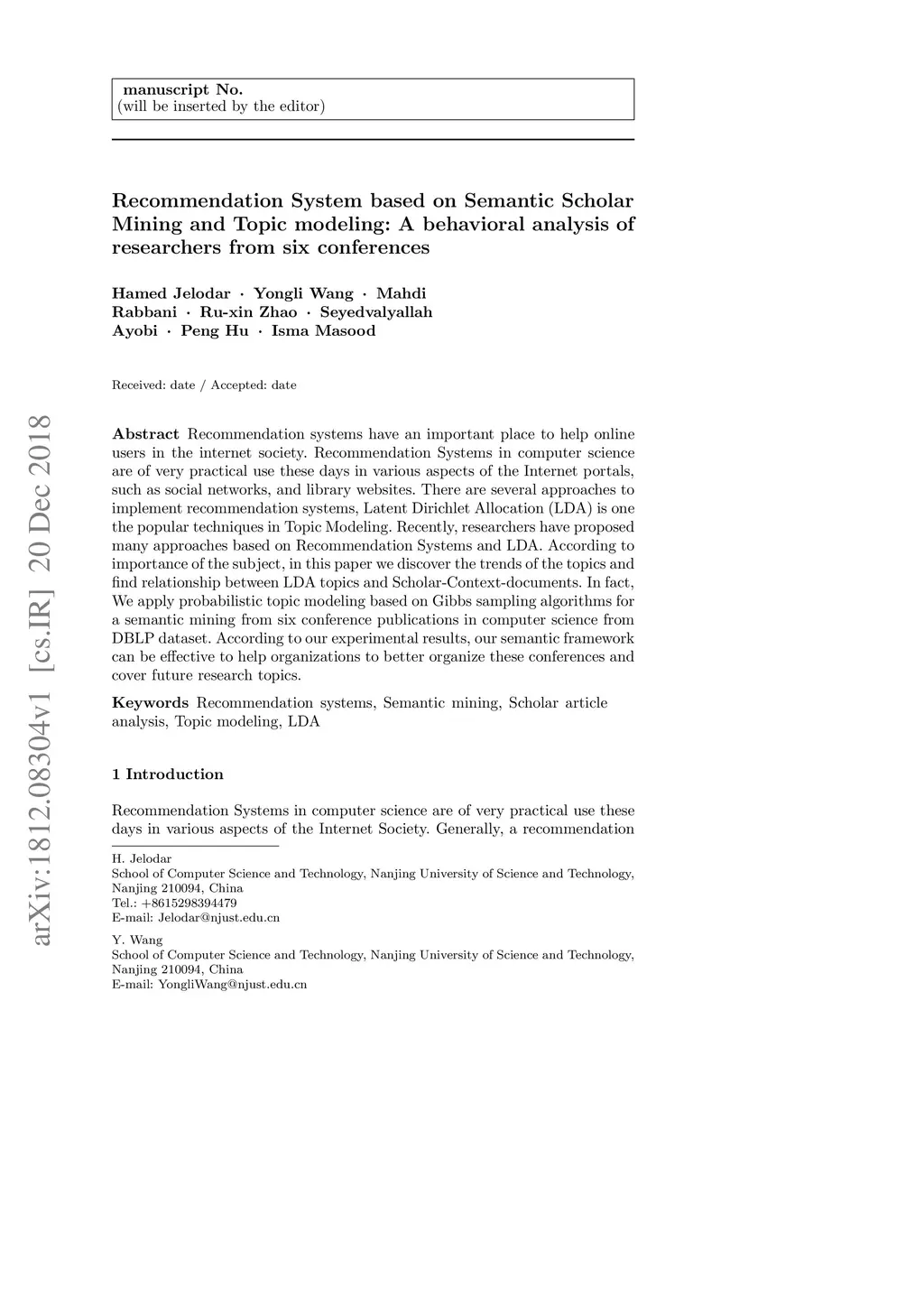 Recommendation System based on Semantic Scholar Mining and Topic