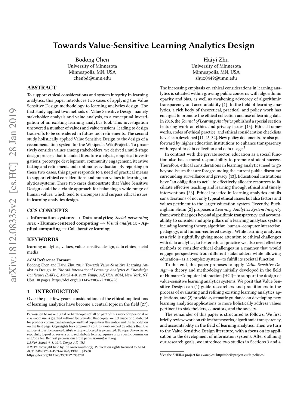 To support ethical considerations and system integrity in learning analytics, this paper introduces two cases of applying the Value Sensitive Design methodology to learning analytics design. The first study applied two methods of Value Sensitive Design, namely stakeholder analysis and value analysis, to a conceptual investigation of an existing learning analytics tool. This investigation uncovered a number of values and value tensions, leading to design trade-offs to be considered in future tool refinements. The second study holistically applied Value Sensitive Design to the design of a recommendation system for the Wikipedia WikiProjects. To proactively consider values among stakeholders, we derived a multi-stage design process that included literature analysis, empirical investigations, prototype development, community engagement, iterative testing and refinement, and continuous evaluation. By reporting on these two cases, this paper responds to a need of practical means to support ethical considerations and human values in learning analytics systems. These two cases demonstrate that Value Sensitive Design could be a viable approach for balancing a wide range of human values, which tend to encompass and surpass ethical issues, in learning analytics design.