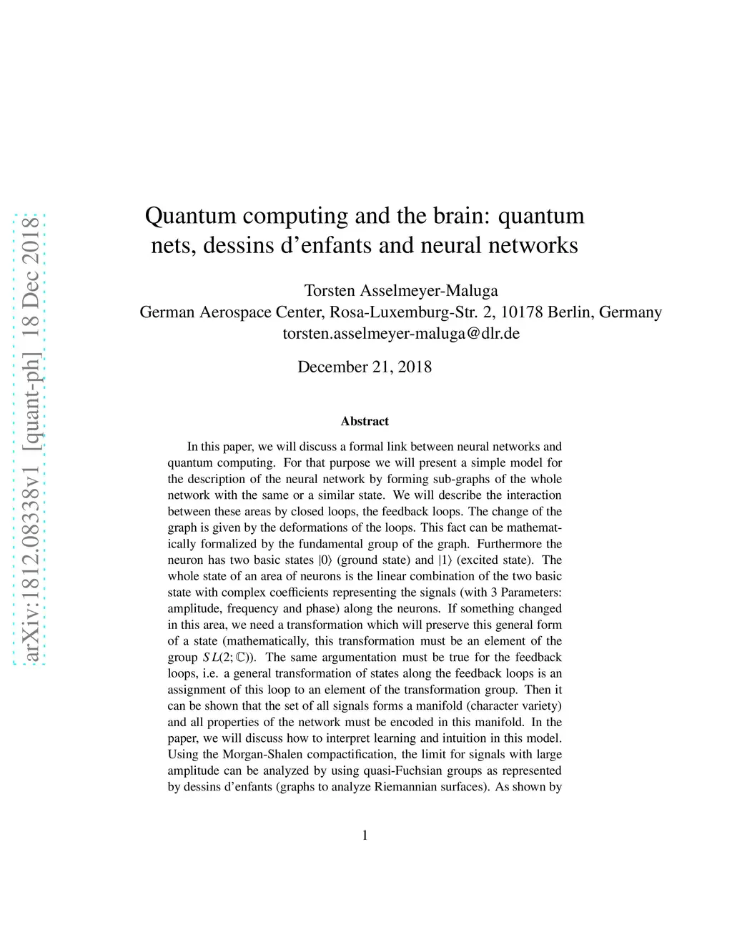 In this paper, we will discuss a formal link between neural networks and quantum computing. For that purpose we will present a simple model for the description of the neural network by forming sub-graphs of the whole network with the same or a similar state. We will describe the interaction between these areas by closed loops, the feedback loops. The change of the graph is given by the deformations of the loops. This fact can be mathematically formalized by the fundamental group of the graph. Furthermore the neuron has two basic states (ground state) and (excited state). The whole state of an area of neurons is the linear combination of the two basic state with complex coefficients representing the signals (with 3 Parameters: amplitude, frequency and phase) along the neurons. Then it can be shown that the set of all signals forms a manifold (character variety) and all properties of the network must be encoded in this manifold. In the paper, we will discuss how to interpret learning and intuition in this model. Using the Morgan-Shalen compactification, the limit for signals with large amplitude can be analyzed by using quasi-Fuchsian groups as represented by dessins dénfants (graphs to analyze Riemannian surfaces). As shown by Planat and collaborators, these dessins dénfants are a direct bridge to (topological) quantum computing with permutation groups. The normalization of the signal reduces to the group and the whole model to a quantum network. Then we have a direct connection to quantum circuits. This network can be transformed into operations on tensor networks. Formally we will obtain a link between machine learning and Quantum computing.