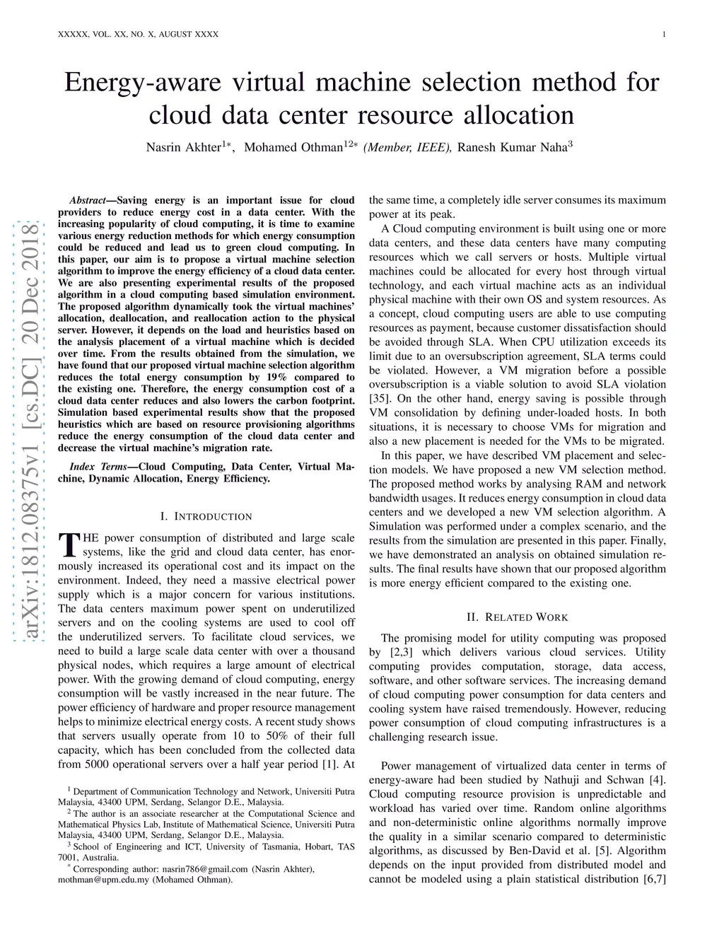 Saving energy is an important issue for cloud providers to reduce energy cost in a data center. With the increasing popularity of cloud computing, it is time to examine various energy reduction methods for which energy consumption could be reduced and lead us to green cloud computing. In this paper, our aim is to propose a virtual machine selection algorithm to improve the energy efficiency of a cloud data center. We are also presenting experimental results of the proposed algorithm in a cloud computing based simulation environment. The proposed algorithm dynamically took the virtual machines' allocation, deallocation, and reallocation action to the physical server. However, it depends on the load and heuristics based on the analysis placement of a virtual machine which is decided over time. From the results obtained from the simulation, we have found that our proposed virtual machine selection algorithm reduces the total energy consumption by 19% compared to the existing one. Therefore, the energy consumption cost of a cloud data center reduces and also lowers the carbon footprint. Simulation-based experimental results show that the proposed heuristics which are based on resource provisioning algorithms reduce the energy consumption of the cloud data center and decrease the virtual machine's migration rate.
