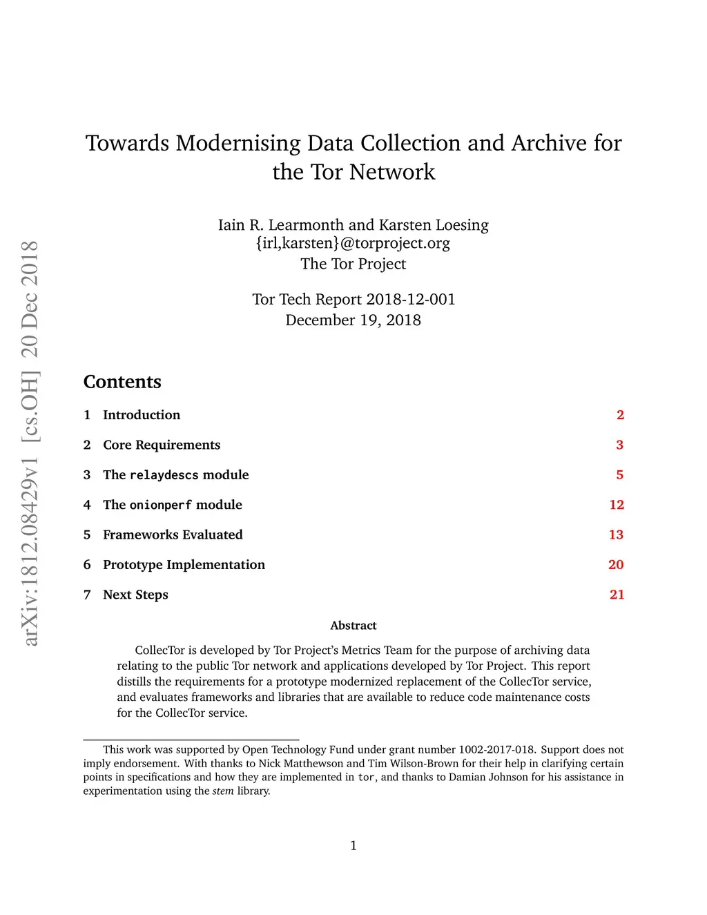 CollecTor is developed by Tor Project's Metrics Team for the purpose of archiving data relating to the public Tor network and applications developed by Tor Project. This report distills the requirements for a prototype modernized replacement of the CollecTor service, and evaluates frameworks and libraries that are available to reduce code maintenance costs for the CollecTor service.