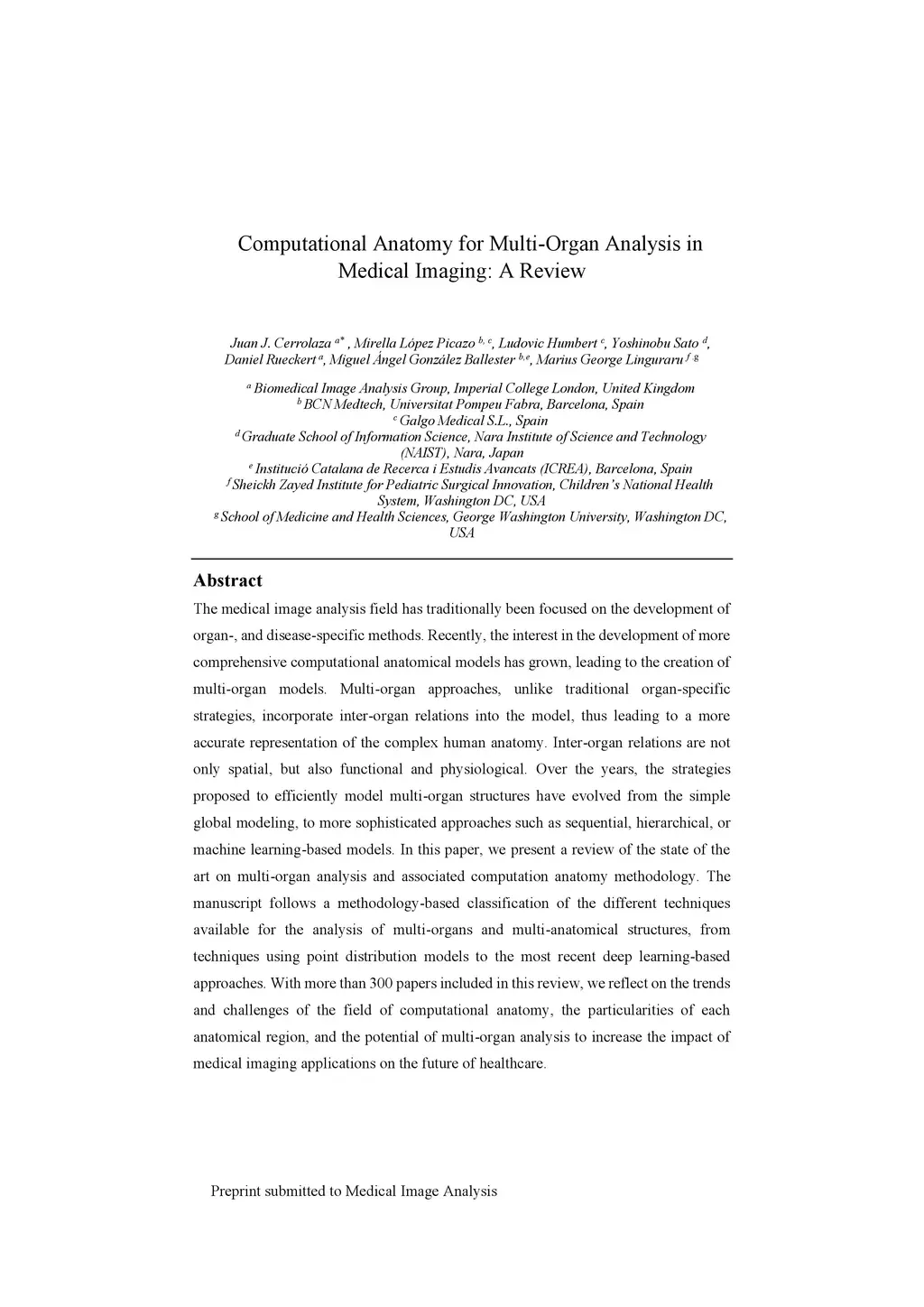The medical image analysis field has traditionally been focused on the development of organ-, and disease-specific methods. Recently, the interest in the development of more 20 comprehensive computational anatomical models has grown, leading to the creation of multi-organ models. Multi-organ approaches, unlike traditional organ-specific strategies, incorporate inter-organ relations into the model, thus leading to a more accurate representation of the complex human anatomy. Inter-organ relations are not only spatial, but also functional and physiological. Over the years, the strategies 25 proposed to efficiently model multi-organ structures have evolved from the simple global modeling, to more sophisticated approaches such as sequential, hierarchical, or machine learning-based models. In this paper, we present a review of the state of the art on multi-organ analysis and associated computation anatomy methodology. The manuscript follows a methodology-based classification of the different techniques 30 available for the analysis of multi-organs and multi-anatomical structures, from techniques using point distribution models to the most recent deep learning-based approaches. With more than 300 papers included in this review, we reflect on the trends and challenges of the field of computational anatomy, the particularities of each anatomical region, and the potential of multi-organ analysis to increase the impact of 35 medical imaging applications on the future of healthcare.