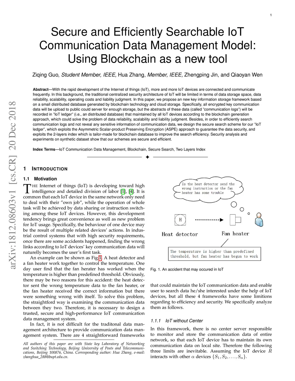 With the rapid development of the Internet of things (IoT), more and more IoT devices are connected and communicate frequently. In this background, the traditional centralized security architecture of IoT will be limited in terms of data storage space, data reliability, scalability, operating costs and liability judgment. In this paper, we propose an new key information storage framework based on a small distributed database generated by blockchain technology and cloud storage. Specifically, all encrypted key communication data will be upload to public could server for enough storage, but the abstracts of these data (called "communication logs") will be recorded in "IoT ledger" (i.e., an distributed database) that maintained by all IoT devices according to the blockchain generation approach, which could solve the problem of data reliability, scalability and liability judgment. Besides, in order to efficiently search communication logs and not reveal any sensitive information of communication data, we design the secure search scheme for our "IoT ledger", which exploits the Asymmetric Scalar-product Preserving Encryption (ASPE) approach to guarantee the data security, and exploits the 2-layers index which is tailor-made for blockchain database to improve the search efficiency. Security analysis and experiments on synthetic dataset show that our schemes are secure and efficient.