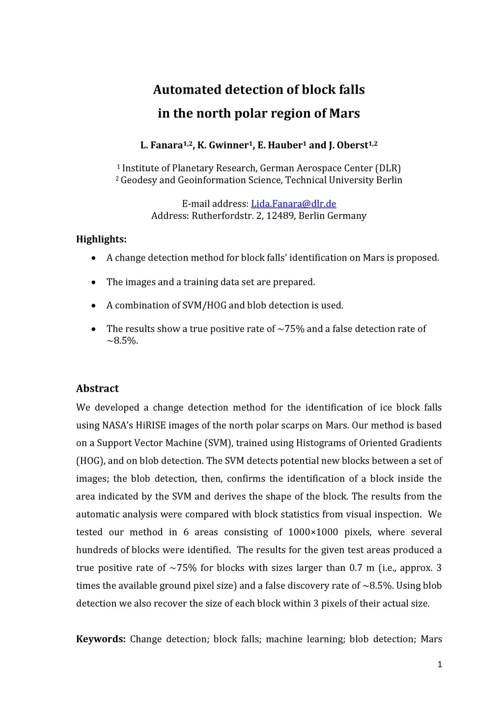 We developed a change detection method for the identification of ice block falls using NASA's HiRISE images of the north polar scarps on Mars. Our method is based on a Support Vector Machine (SVM), trained using Histograms of Oriented Gradients (HOG), and on blob detection. The SVM detects potential new blocks between a set of images; the blob detection, then, confirms the identification of a block inside the area indicated by the SVM and derives the shape of the block. The results from the automatic analysis were compared with block statistics from visual inspection. We tested our method in 6 areas consisting of 1000x1000 pixels, where several hundreds of blocks were identified. The results for the given test areas produced a true positive rate of ~75% for blocks with sizes larger than 0.7 m (i.e., approx. 3 times the available ground pixel size) and a false discovery rate of ~8.5%. Using blob detection we also recover the size of each block within 3 pixels of their actual size.