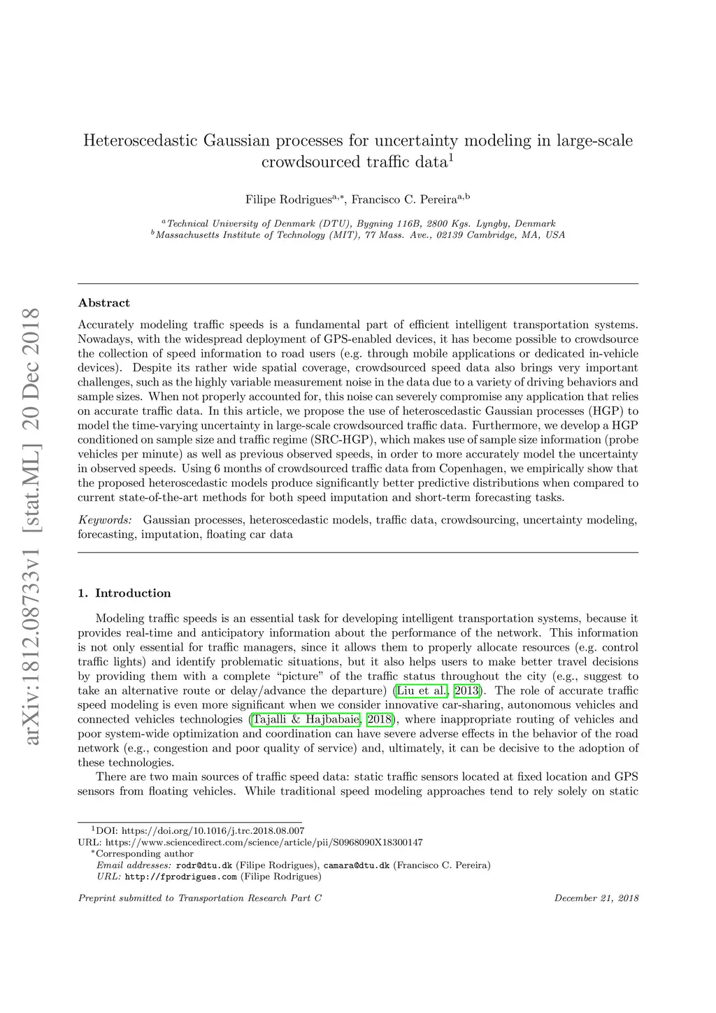 Accurately modeling traffic speeds is a fundamental part of efficient intelligent transportation systems. Nowadays, with the widespread deployment of GPS-enabled devices, it has become possible to crowdsource the collection of speed information to road users (e.g. through mobile applications or dedicated in-vehicle devices). Despite its rather wide spatial coverage, crowdsourced speed data also brings very important challenges, such as the highly variable measurement noise in the data due to a variety of driving behaviors and sample sizes. When not properly accounted for, this noise can severely compromise any application that relies on accurate traffic data. In this article, we propose the use of heteroscedastic Gaussian processes (HGP) to model the time-varying uncertainty in large-scale crowdsourced traffic data. Furthermore, we develop a HGP conditioned on sample size and traffic regime (SRC-HGP), which makes use of sample size information (probe vehicles per minute) as well as previous observed speeds, in order to more accurately model the uncertainty in observed speeds. Using 6 months of crowdsourced traffic data from Copenhagen, we empirically show that the proposed heteroscedastic models produce significantly better predictive distributions when compared to current state-of-the-art methods for both speed imputation and short-term forecasting tasks.