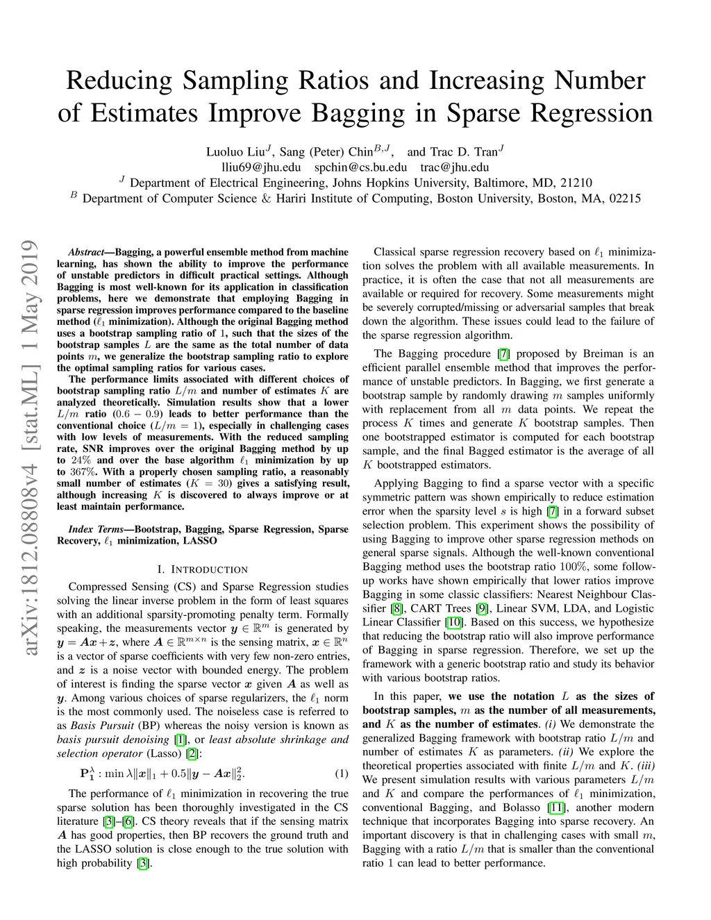 Bagging, a powerful ensemble method from machine learning, improves the performance of unstable predictors. Although the power of Bagging has been shown mostly in classification problems, we demonstrate the success of employing Bagging in sparse regression over the baseline method (L1 minimization). The framework employs the generalized version of the original Bagging with various bootstrap ratios. The performance limits associated with different choices of bootstrap sampling ratio L/m and number of estimates K is analyzed theoretically. Simulation shows that the proposed method yields state-of-the-art recovery performance, outperforming L1 minimization and Bolasso in the challenging case of low levels of measurements. A lower L/m ratio (60% - 90%) leads to better performance, especially with a small number of measurements. With the reduced sampling rate, SNR improves over the original Bagging by up to 24%. With a properly chosen sampling ratio, a reasonably small number of estimates K = 30 gives satisfying result, even though increasing K is discovered to always improve or at least maintain the performance.