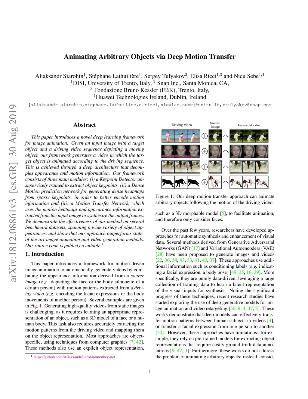 This paper introduces a novel deep learning framework for image animation. Given an input image with a target object and a driving video sequence depicting a moving object, our framework generates a video in which the target object is animated according to the driving sequence. This is achieved through a deep architecture that decouples appearance and motion information. Our framework consists of three main modules: (i) a Keypoint Detector unsupervisely trained to extract object keypoints, (ii) a Dense Motion prediction network for generating dense heatmaps from sparse keypoints, in order to better encode motion information and (iii) a Motion Transfer Network, which uses the motion heatmaps and appearance information extracted from the input image to synthesize the output frames. We demonstrate the effectiveness of our method on several benchmark datasets, spanning a wide variety of object appearances, and show that our approach outperforms state-of-the-art image animation and video generation methods. Our source code is publicly available.