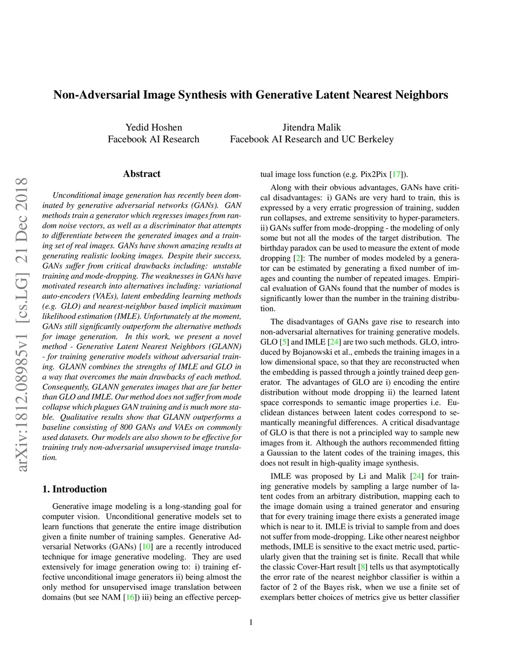 Unconditional image generation has recently been dominated by generative adversarial networks (GANs). GAN methods train a generator which regresses images from random noise vectors, as well as a discriminator that attempts to differentiate between the generated images and a training set of real images. GANs have shown amazing results at generating realistic looking images. Despite their success, GANs suffer from critical drawbacks including: unstable training and mode-dropping. The weaknesses in GANs have motivated research into alternatives including: variational auto-encoders (VAEs), latent embedding learning methods (e.g. GLO) and nearest-neighbor based implicit maximum likelihood estimation (IMLE). Unfortunately at the moment, GANs still significantly outperform the alternative methods for image generation. In this work, we present a novel method - Generative Latent Nearest Neighbors (GLANN) - for training generative models without adversarial training. GLANN combines the strengths of IMLE and GLO in a way that overcomes the main drawbacks of each method. Consequently, GLANN generates images that are far better than GLO and IMLE. Our method does not suffer from mode collapse which plagues GAN training and is much more stable. Qualitative results show that GLANN outperforms a baseline consisting of 800 GANs and VAEs on commonly used datasets. Our models are also shown to be effective for training truly non-adversarial unsupervised image translation.
