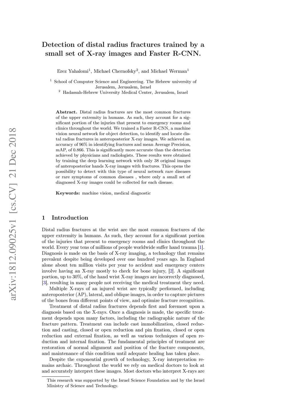 Distal radius fractures are the most common fractures of the upper extremity in humans. As such, they account for a significant portion of the injuries that present to emergency rooms and clinics throughout the world. We trained a Faster R-CNN, a machine vision neural network for object detection, to identify and locate distal radius fractures in anteroposterior X-ray images. We achieved an accuracy of 96\% in identifying fractures and mean Average Precision, mAP, of 0.866. This is significantly more accurate than the detection achieved by physicians and radiologists. These results were obtained by training the deep learning network with only 38 original images of anteroposterior hands X-ray images with fractures. This opens the possibility to detect with this type of neural network rare diseases or rare symptoms of common diseases , where only a small set of diagnosed X-ray images could be collected for each disease.