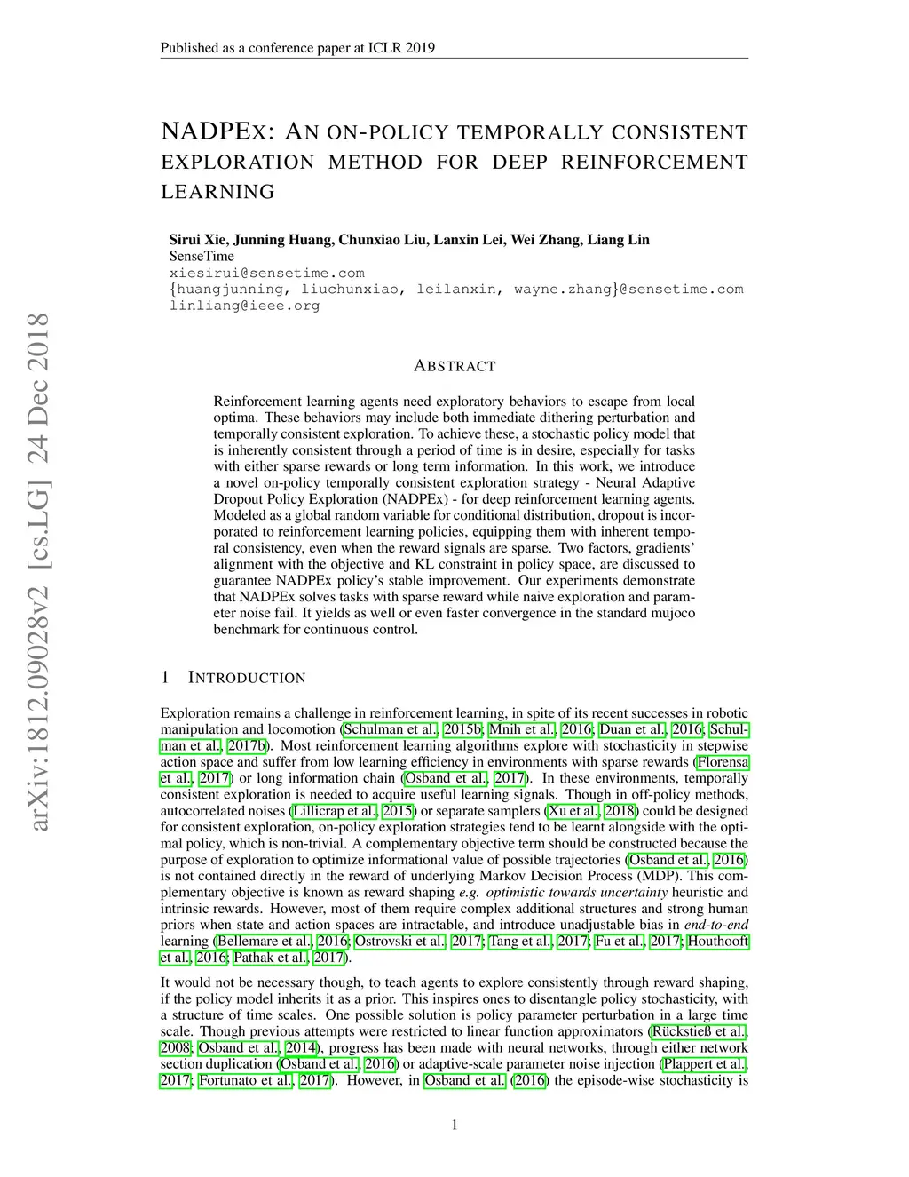 Reinforcement learning agents need exploratory behaviors to escape from local optima. These behaviors may include both immediate dithering perturbation and temporally consistent exploration. To achieve these, a stochastic policy model that is inherently consistent through a period of time is in desire, especially for tasks with either sparse rewards or long term information. In this work, we introduce a novel on-policy temporally consistent exploration strategy - Neural Adaptive Dropout Policy Exploration (NADPEx) - for deep reinforcement learning agents. Modeled as a global random variable for conditional distribution, dropout is incorporated to reinforcement learning policies, equipping them with inherent temporal consistency, even when the reward signals are sparse. Two factors, gradients' alignment with the objective and KL constraint in policy space, are discussed to guarantee NADPEx policy's stable improvement. Our experiments demonstrate that NADPEx solves tasks with sparse reward while naive exploration and parameter noise fail. It yields as well or even faster convergence in the standard mujoco benchmark for continuous control.