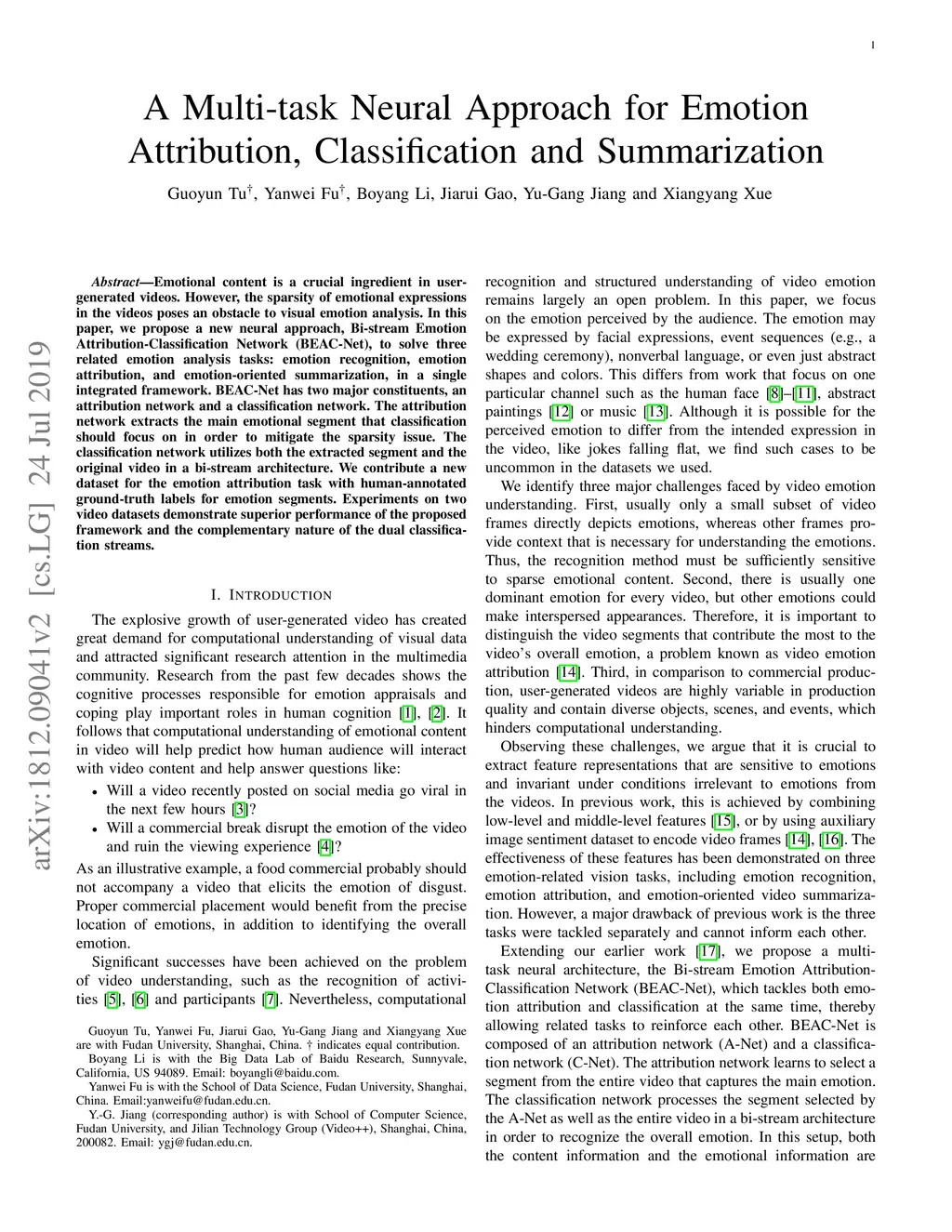 Emotional content is a crucial ingredient in user-generated videos. However, the sparsity of emotional expressions in the videos poses an obstacle to visual emotion analysis. In this paper, we propose a new neural approach, Bi-stream Emotion Attribution-Classification Network (BEAC-Net), to solve three related emotion analysis tasks: emotion recognition, emotion attribution, and emotion-oriented summarization, in a single integrated framework. BEAC-Net has two major constituents, an attribution network and a classification network. The attribution network extracts the main emotional segment that classification should focus on in order to mitigate the sparsity issue. The classification network utilizes both the extracted segment and the original video in a bi-stream architecture. We contribute a new dataset for the emotion attribution task with human-annotated ground-truth labels for emotion segments. Experiments on two video datasets demonstrate superior performance of the proposed framework and the complementary nature of the dual classification streams.