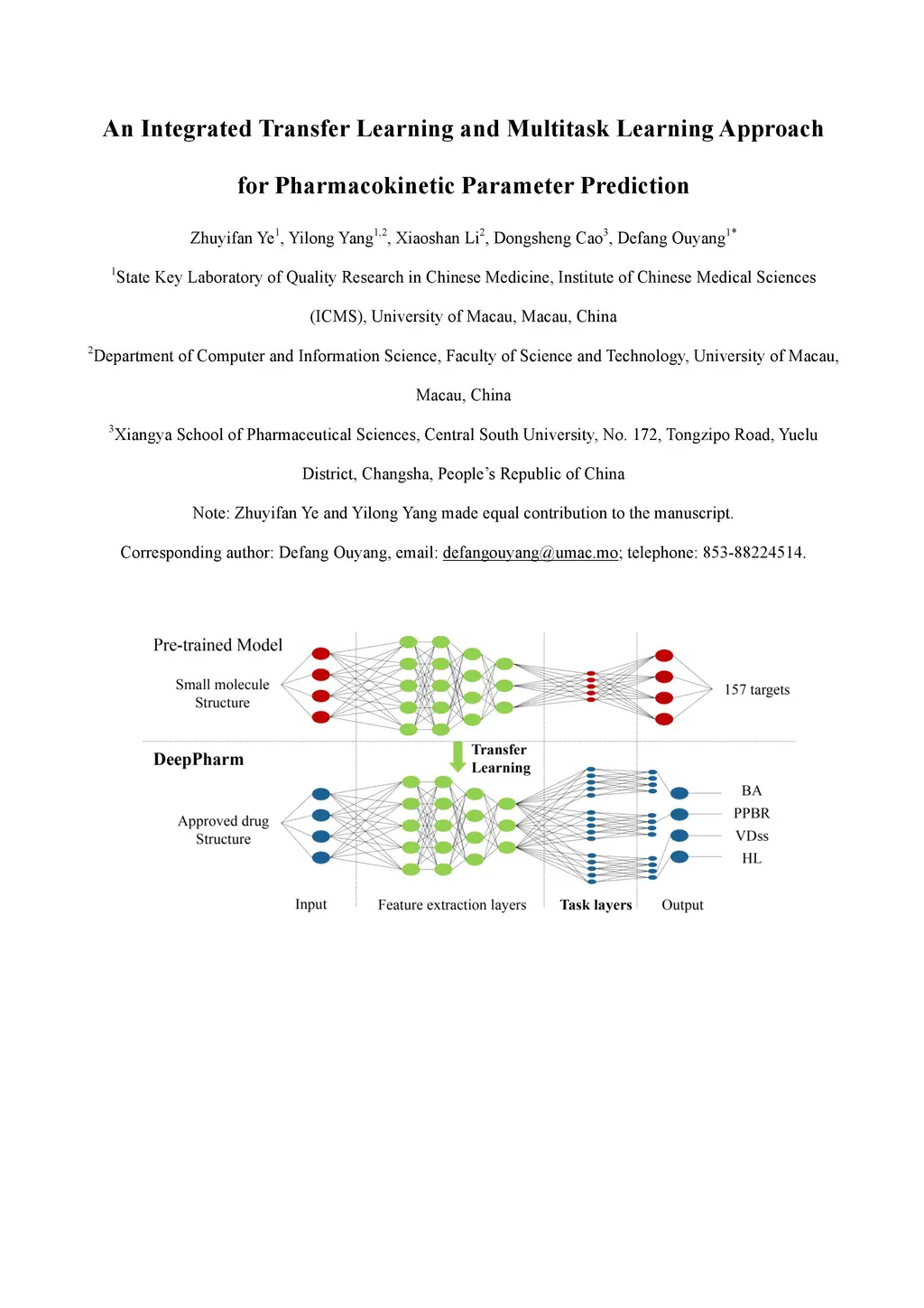 Background: Pharmacokinetic evaluation is one of the key processes in drug discovery and development. However, current absorption, distribution, metabolism, excretion prediction models still have limited accuracy. Aim: This study aims to construct an integrated transfer learning and multitask learning approach for developing quantitative structure-activity relationship models to predict four human pharmacokinetic parameters. Methods: A pharmacokinetic dataset included 1104 U.S. FDA approved small molecule drugs. The dataset included four human pharmacokinetic parameter subsets (oral bioavailability, plasma protein binding rate, apparent volume of distribution at steady-state and elimination half-life). The pre-trained model was trained on over 30 million bioactivity data. An integrated transfer learning and multitask learning approach was established to enhance the model generalization. Results: The pharmacokinetic dataset was split into three parts (60:20:20) for training, validation and test by the improved Maximum Dissimilarity algorithm with the representative initial set selection algorithm and the weighted distance function. The multitask learning techniques enhanced the model predictive ability. The integrated transfer learning and multitask learning model demonstrated the best accuracies, because deep neural networks have the general feature extraction ability, transfer learning and multitask learning improved the model generalization. Conclusions: The integrated transfer learning and multitask learning approach with the improved dataset splitting algorithm was firstly introduced to predict the pharmacokinetic parameters. This method can be further employed in drug discovery and development.