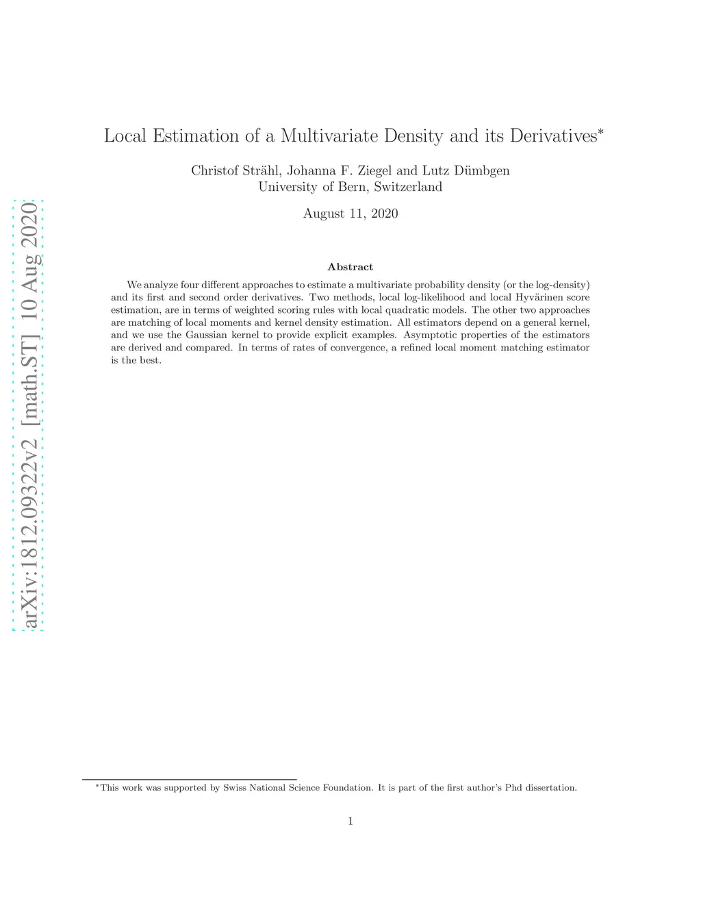 We analyze four different approaches to estimate a multivariate probability density (or the log-density) and its first and second order derivatives. Two methods, local log-likelihood and local Hyv\"arinen score estimation, are in terms of weighted scoring rules with local quadratic models. The other two approaches are matching of local moments and kernel density estimation. All estimators depend on a general kernel, and we use the Gaussian kernel to provide explicit examples. Asymptotic properties of the estimators are derived and compared. In terms of rates of convergence, a refined local moment matching estimator is the best.