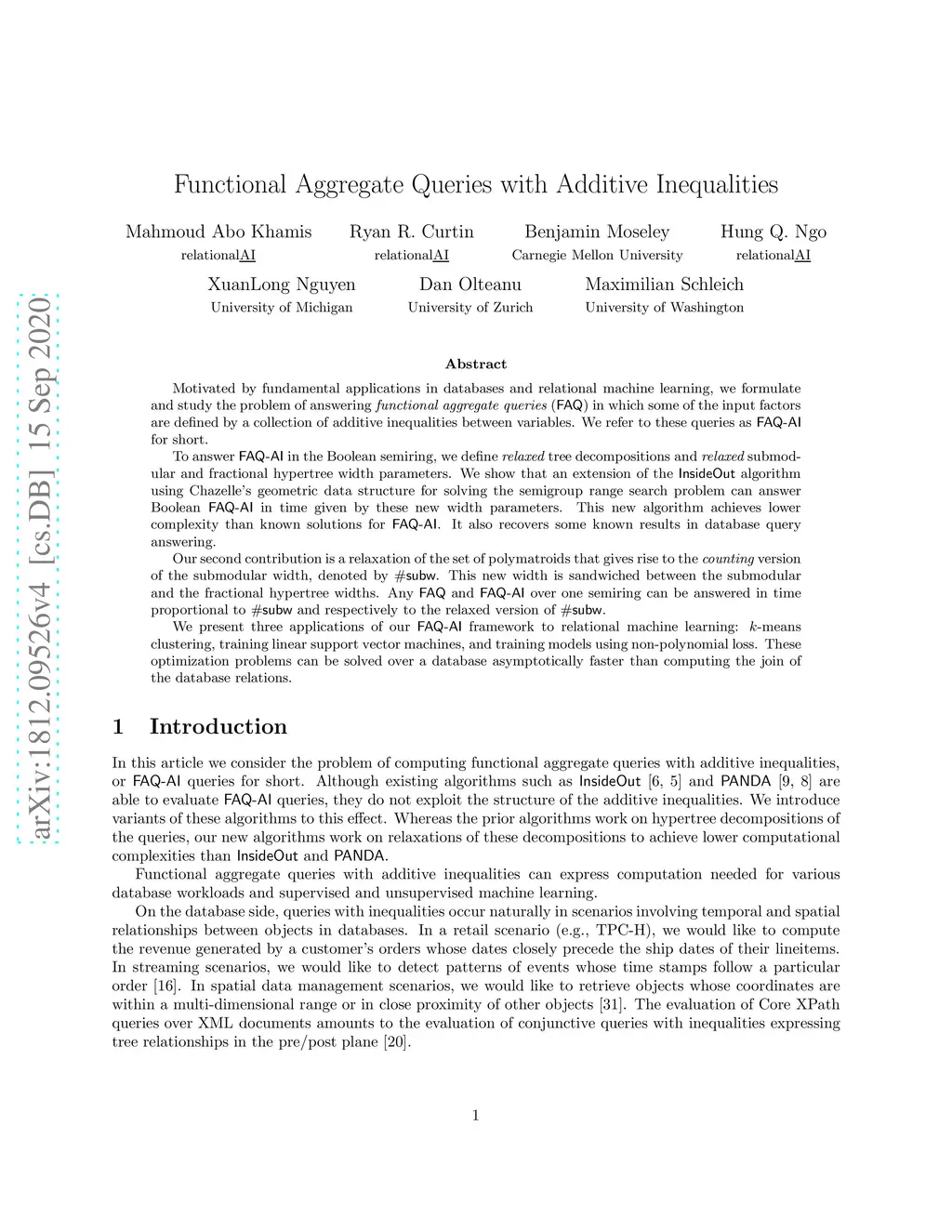 Motivated by fundamental applications in databases and relational machine learning, we formulate and study the problem of answering functional aggregate queries (FAQ) in which some of the input factors are defined by a collection of additive inequalities between variables. We refer to these queries as FAQ-AI for short. To answer FAQ-AI in the Boolean semiring, we define relaxed tree decompositions and relaxed submodular and fractional hypertree width parameters. We show that an extension of the InsideOut algorithm using Chazelle's geometric data structure for solving the semigroup range search problem can answer Boolean FAQ-AI in time given by these new width parameters. This new algorithm achieves lower complexity than known solutions for FAQ-AI. It also recovers some known results in database query answering. Our second contribution is a relaxation of the set of polymatroids that gives rise to the counting version of the submodular width, denoted by #subw. This new width is sandwiched between the submodular and the fractional hypertree widths. Any FAQ and FAQ-AI over one semiring can be answered in time proportional to #subw and respectively to the relaxed version of #subw. We present three applications of our FAQ-AI framework to relational machine learning: k-means clustering, training linear support vector machines, and training models using non-polynomial loss. These optimization problems can be solved over a database asymptotically faster than computing the join of the database relations.