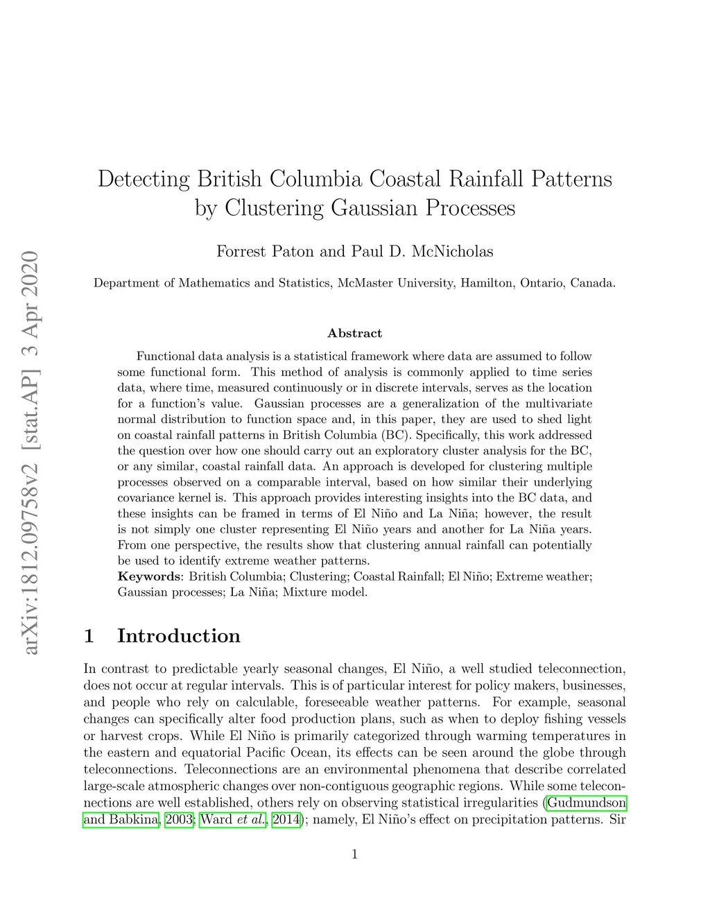 Functional data analysis is a statistical framework where data are assumed to follow some functional form. This method of analysis is commonly applied to time series data, where time, measured continuously or in discrete intervals, serves as the location for a function's value. Gaussian processes are a generalization of the multivariate normal distribution to function space and, in this paper, they are used to shed light on coastal rainfall patterns in British Columbia (BC). Specifically, this work addressed the question over how one should carry out an exploratory cluster analysis for the BC, or any similar, coastal rainfall data. An approach is developed for clustering multiple processes observed on a comparable interval, based on how similar their underlying covariance kernel is. This approach provides interesting insights into the BC data, and these insights can be framed in terms of El Ni\~{n}o and La Ni\~{n}a; however, the result is not simply one cluster representing El Ni\~{n}o years and another for La Ni\~{n}a years. From one perspective, the results show that clustering annual rainfall can potentially be used to identify extreme weather patterns.