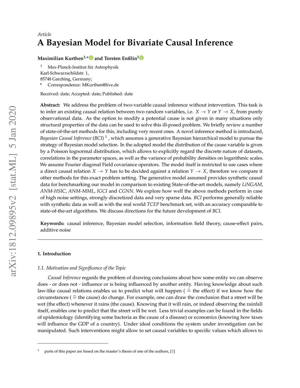 We address the problem of two-variable causal inference without intervention. This task is to infer an existing causal relation between two random variables, i.e. or , from purely observational data. As the option to modify a potential cause is not given in many situations only structural properties of the data can be used to solve this ill-posed problem. We briefly review a number of state-of-the-art methods for this, including very recent ones. A novel inference method is introduced, Bayesian Causal Inference (BCI), which assumes a generative Bayesian hierarchical model to pursue the strategy of Bayesian model selection. In the adopted model the distribution of the cause variable is given by a Poisson lognormal distribution, which allows to explicitly regard the discrete nature of datasets, correlations in the parameter spaces, as well as the variance of probability densities on logarithmic scales. We assume Fourier diagonal Field covariance operators. The model itself is restricted to use cases where a direct causal relation has to be decided against a relation , therefore we compare it other methods for this exact problem setting. The generative model assumed provides synthetic causal data for benchmarking our model in comparison to existing State-of-the-art models, namely LiNGAM , ANM-HSIC , ANM-MML , IGCI and CGNN . We explore how well the above methods perform in case of high noise settings, strongly discretized data and very sparse data. BCI performs generally reliable with synthetic data as well as with the real world TCEP benchmark set, with an accuracy comparable to state-of-the-art algorithms. We discuss directions for the future development of BCI .