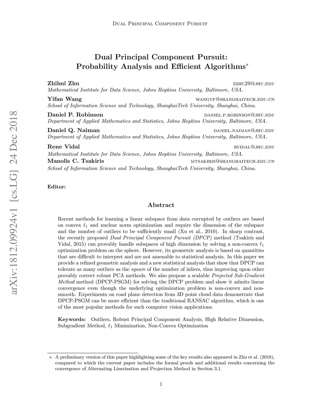 Recent methods for learning a linear subspace from data corrupted by outliers are based on convex and nuclear norm optimization and require the dimension of the subspace and the number of outliers to be sufficiently small. In sharp contrast, the recently proposed Dual Principal Component Pursuit (DPCP) method can provably handle subspaces of high dimension by solving a non-convex optimization problem on the sphere. However, its geometric analysis is based on quantities that are difficult to interpret and are not amenable to statistical analysis. In this paper we provide a refined geometric analysis and a new statistical analysis that show that DPCP can tolerate as many outliers as the square of the number of inliers, thus improving upon other provably correct robust PCA methods. We also propose a scalable Projected Sub-Gradient Method method (DPCP-PSGM) for solving the DPCP problem and show it admits linear convergence even though the underlying optimization problem is non-convex and non-smooth. Experiments on road plane detection from 3D point cloud data demonstrate that DPCP-PSGM can be more efficient than the traditional RANSAC algorithm, which is one of the most popular methods for such computer vision applications.