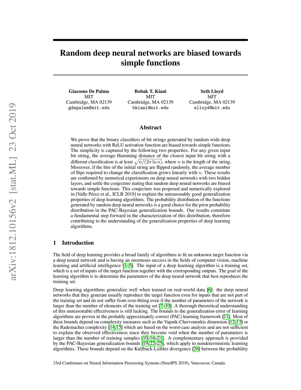 We prove that the binary classifiers of bit strings generated by random wide deep neural networks with ReLU activation function are biased towards simple functions. The simplicity is captured by the following two properties. For any given input bit string, the average Hamming distance of the closest input bit string with a different classification is at least sqrt(n / (2{\pi} log n)), where n is the length of the string. Moreover, if the bits of the initial string are flipped randomly, the average number of flips required to change the classification grows linearly with n. These results are confirmed by numerical experiments on deep neural networks with two hidden layers, and settle the conjecture stating that random deep neural networks are biased towards simple functions. This conjecture was proposed and numerically explored in [Valle P\érez et al., ICLR 2019] to explain the unreasonably good generalization properties of deep learning algorithms. The probability distribution of the functions generated by random deep neural networks is a good choice for the prior probability distribution in the PAC-Bayesian generalization bounds. Our results constitute a fundamental step forward in the characterization of this distribution, therefore contributing to the understanding of the generalization properties of deep learning algorithms.