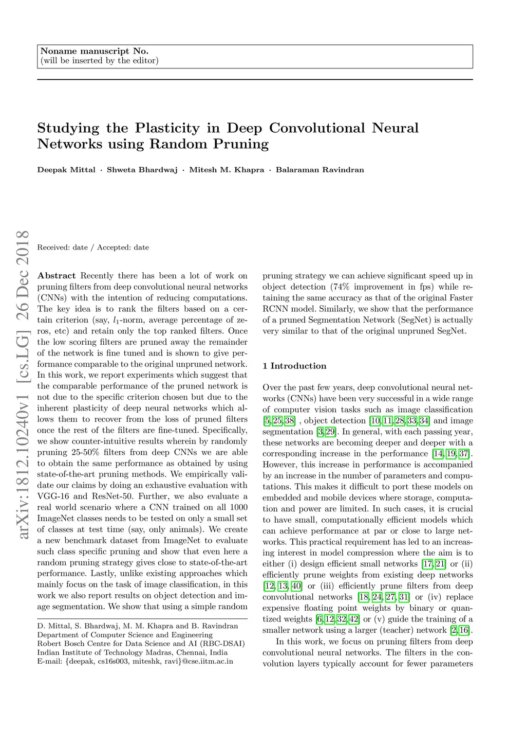 Recently there has been a lot of work on pruning filters from deep convolutional neural networks (CNNs) with the intention of reducing computations.The key idea is to rank the filters based on a certain criterion (say, l1-norm) and retain only the top ranked filters. Once the low scoring filters are pruned away the remainder of the network is fine tuned and is shown to give performance comparable to the original unpruned network. In this work, we report experiments which suggest that the comparable performance of the pruned network is not due to the specific criterion chosen but due to the inherent plasticity of deep neural networks which allows them to recover from the loss of pruned filters once the rest of the filters are fine-tuned. Specifically we show counter-intuitive results wherein by randomly pruning 25-50% filters from deep CNNs we are able to obtain the same performance as obtained by using state-of-the-art pruning methods. We empirically validate our claims by doing an exhaustive evaluation with VGG-16 and ResNet-50. We also evaluate a real world scenario where a CNN trained on all 1000 ImageNet classes needs to be tested on only a small set of classes at test time (say, only animals). We create a new benchmark dataset from ImageNet to evaluate such class specific pruning and show that even here a random pruning strategy gives close to state-of-the-art performance. Unlike existing approaches which mainly focus on the task of image classification, in this work we also report results on object detection and image segmentation. We show that using a simple random pruning strategy we can achieve significant speed up in object detection (74% improvement in fps) while retaining the same accuracy as that of the original Faster RCNN model. Similarly we show that the performance of a pruned Segmentation Network (SegNet) is actually very similar to that of the original unpruned SegNet.