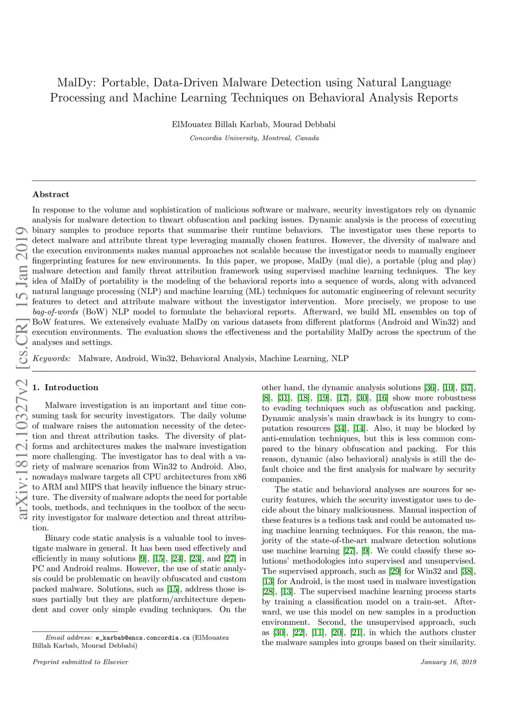 In response to the volume and sophistication of malicious software or malware, security investigators rely on dynamic analysis for malware detection to thwart obfuscation and packing issues. Dynamic analysis is the process of executing binary samples to produce reports that summarise their runtime behaviors. The investigator uses these reports to detect malware and attribute threat type leveraging manually chosen features. However, the diversity of malware and the execution environments makes manual approaches not scalable because the investigator needs to manually engineer fingerprinting features for new environments. In this paper, we propose, MalDy (mal~die), a portable (plug and play) malware detection and family threat attribution framework using supervised machine learning techniques. The key idea of MalDy portability is the modeling of the behavioral reports into a sequence of words, along with advanced natural language processing (NLP) and machine learning (ML) techniques for automatic engineering of relevant security features to detect and attribute malware without the investigator intervention. More precisely, we propose to use bag-of-words (BoW) NLP model to formulate the behavioral reports. Afterward, we build ML ensembles on top of BoW features. We extensively evaluate MalDy on various datasets from different platforms (Android and Win32) and execution environments. The evaluation shows the effectiveness and the portability MalDy across the spectrum of the analyses and settings.