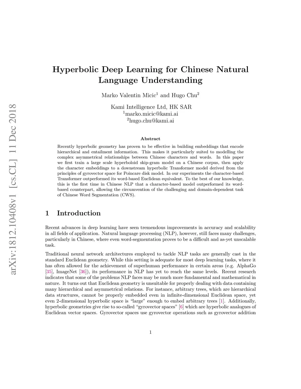 Hyperbolic Deep Learning for Chinese Natural Language Understanding