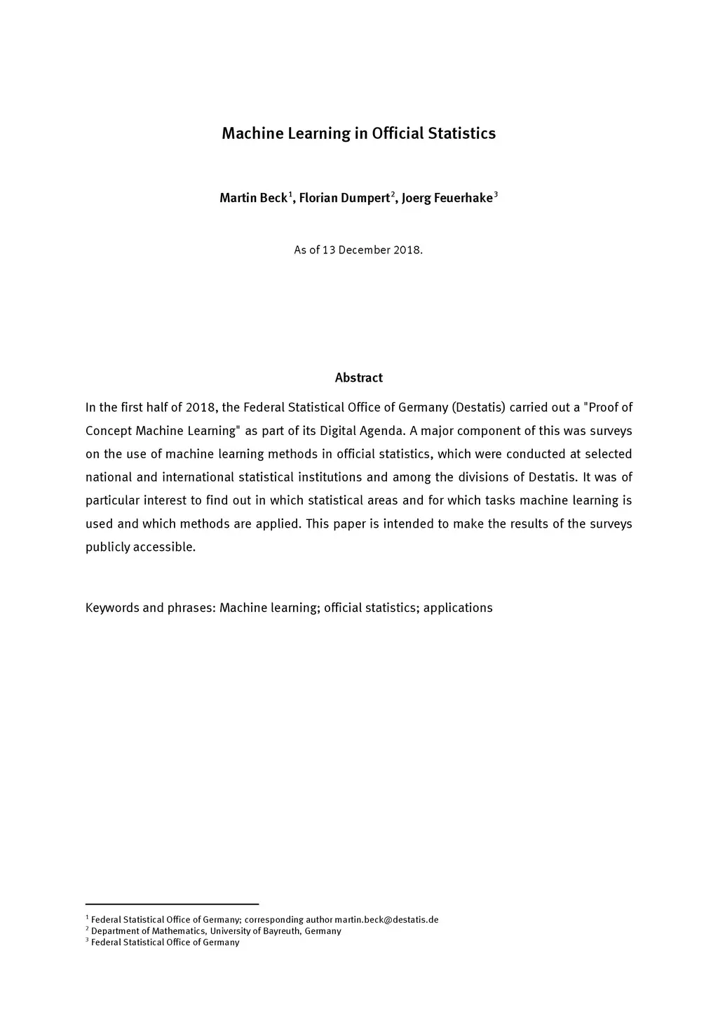 In the first half of 2018, the Federal Statistical Office of Germany (Destatis) carried out a "Proof of Concept Machine Learning" as part of its Digital Agenda. A major component of this was surveys on the use of machine learning methods in official statistics, which were conducted at selected national and international statistical institutions and among the divisions of Destatis. It was of particular interest to find out in which statistical areas and for which tasks machine learning is used and which methods are applied. This paper is intended to make the results of the surveys publicly accessible.