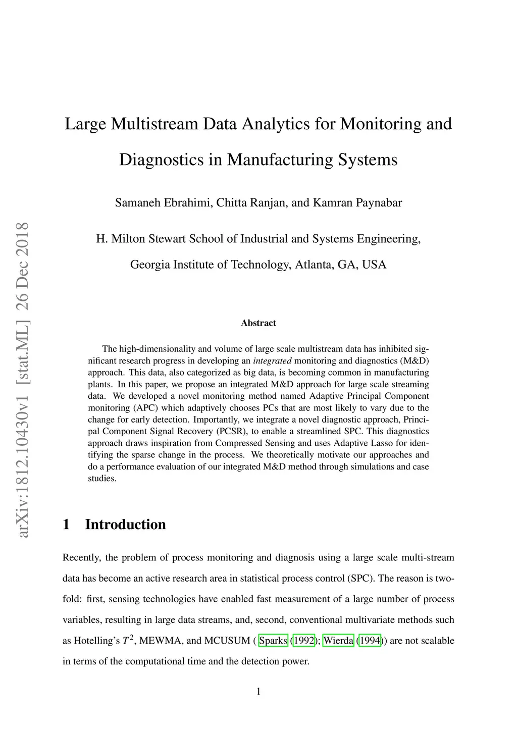The high-dimensionality and volume of large scale multistream data has inhibited significant research progress in developing an integrated monitoring and diagnostics (M&D) approach. This data, also categorized as big data, is becoming common in manufacturing plants. In this paper, we propose an integrated M\&D approach for large scale streaming data. We developed a novel monitoring method named Adaptive Principal Component monitoring (APC) which adaptively chooses PCs that are most likely to vary due to the change for early detection. Importantly, we integrate a novel diagnostic approach, Principal Component Signal Recovery (PCSR), to enable a streamlined SPC. This diagnostics approach draws inspiration from Compressed Sensing and uses Adaptive Lasso for identifying the sparse change in the process. We theoretically motivate our approaches and do a performance evaluation of our integrated M&D method through simulations and case studies.