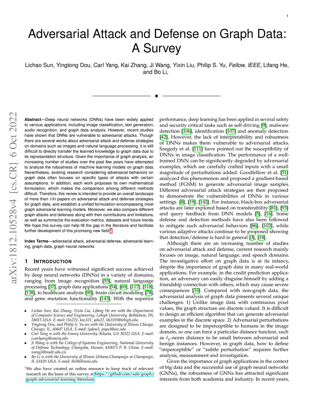 Deep neural networks (DNNs) have been widely applied to various applications, including image classification, text generation, audio recognition, and graph data analysis. However, recent studies have shown that DNNs are vulnerable to adversarial attacks. Though there are several works about adversarial attack and defense strategies on domains such as images and natural language processing, it is still difficult to directly transfer the learned knowledge to graph data due to its representation structure. Given the importance of graph analysis, an increasing number of studies over the past few years have attempted to analyze the robustness of machine learning models on graph data. Nevertheless, existing research considering adversarial behaviors on graph data often focuses on specific types of attacks with certain assumptions. In addition, each work proposes its own mathematical formulation, which makes the comparison among different methods difficult. Therefore, this review is intended to provide an overall landscape of more than 100 papers on adversarial attack and defense strategies for graph data, and establish a unified formulation encompassing most graph adversarial learning models. Moreover, we also compare different graph attacks and defenses along with their contributions and limitations, as well as summarize the evaluation metrics, datasets and future trends. We hope this survey can help fill the gap in the literature and facilitate further development of this promising new field.