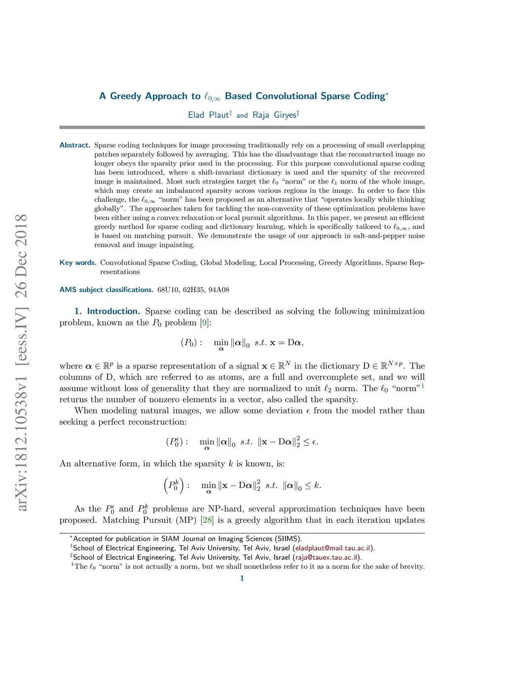 Sparse coding techniques for image processing traditionally rely on a processing of small overlapping patches separately followed by averaging. This has the disadvantage that the reconstructed image no longer obeys the sparsity prior used in the processing. For this purpose convolutional sparse coding has been introduced, where a shift-invariant dictionary is used and the sparsity of the recovered image is maintained. Most such strategies target the "norm" or the norm of the whole image, which may create an imbalanced sparsity across various regions in the image. In order to face this challenge, the "norm" has been proposed as an alternative that "operates locally while thinking globally". The approaches taken for tackling the non-convexity of these optimization problems have been either using a convex relaxation or local pursuit algorithms. In this paper, we present an efficient greedy method for sparse coding and dictionary learning, which is specifically tailored to , and is based on matching pursuit. We demonstrate the usage of our approach in salt-and-pepper noise removal and image inpainting. A code package which reproduces the experiments presented in this work is available at https://web.eng.tau.ac.il/~raja