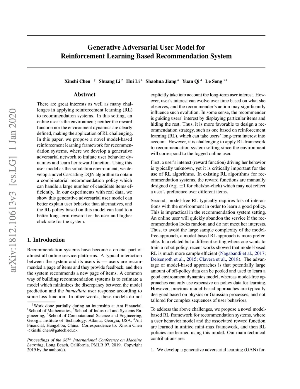 There are great interests as well as many challenges in applying reinforcement learning (RL) to recommendation systems. In this setting, an online user is the environment; neither the reward function nor the environment dynamics are clearly defined, making the application of RL challenging. In this paper, we propose a novel model-based reinforcement learning framework for recommendation systems, where we develop a generative adversarial network to imitate user behavior dynamics and learn her reward function. Using this user model as the simulation environment, we develop a novel Cascading DQN algorithm to obtain a combinatorial recommendation policy which can handle a large number of candidate items efficiently. In our experiments with real data, we show this generative adversarial user model can better explain user behavior than alternatives, and the RL policy based on this model can lead to a better long-term reward for the user and higher click rate for the system.