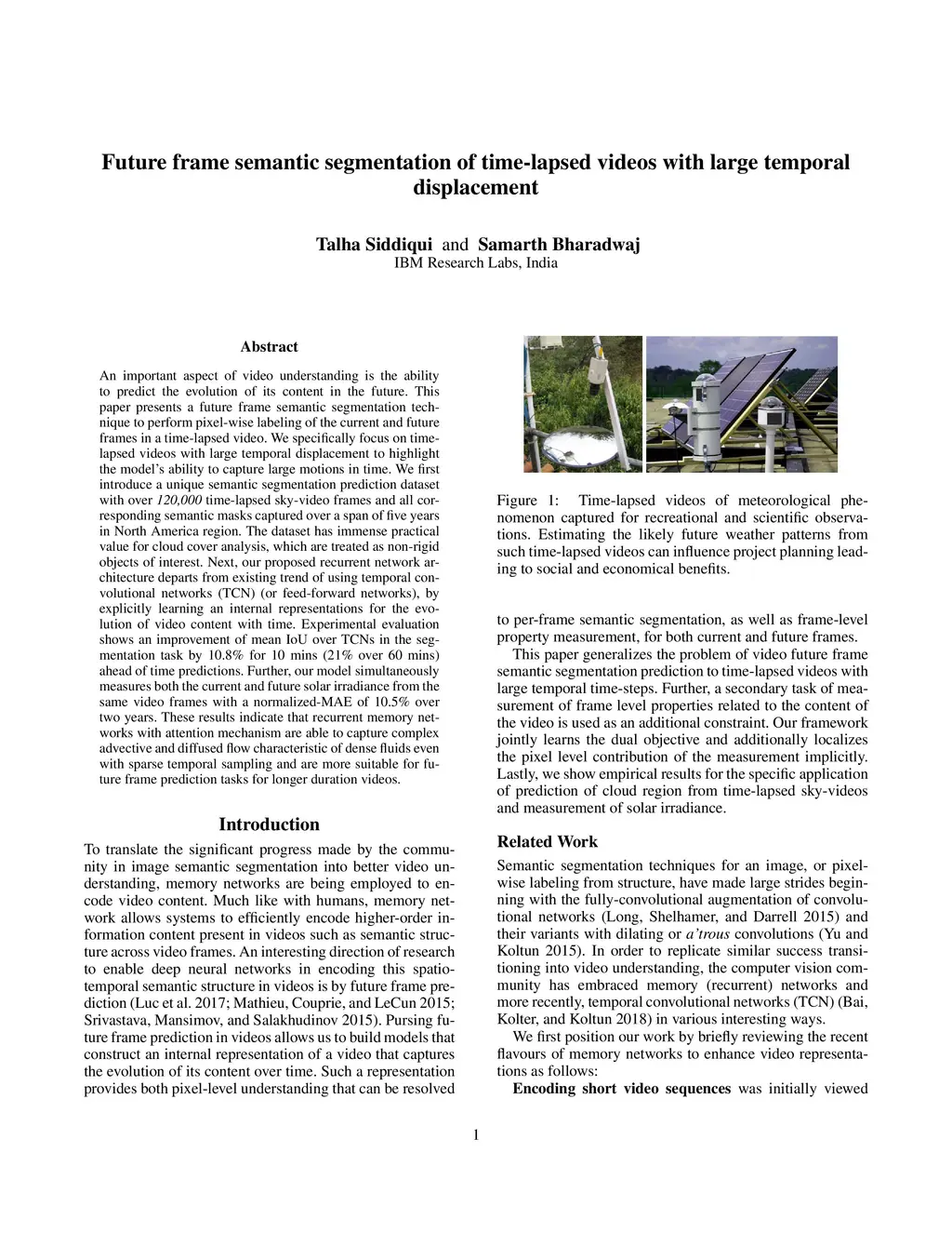 An important aspect of video understanding is the ability to predict the evolution of its content in the future. This paper presents a future frame semantic segmentation technique for predicting semantic masks of the current and future frames in a time-lapsed video. We specifically focus on time-lapsed videos with large temporal displacement to highlight the model's ability to capture large motions in time. We first introduce a unique semantic segmentation prediction dataset with over 120,000 time-lapsed sky-video frames and all corresponding semantic masks captured over a span of five years in North America region. The dataset has immense practical value for cloud cover analysis, which are treated as non-rigid objects of interest. %Here the model provides both semantic segmentation of cloud region and solar irradiance emitted from a region from the sky-videos. Next, our proposed recurrent network architecture departs from existing trend of using temporal convolutional networks (TCN) (or feed-forward networks), by explicitly learning an internal representations for the evolution of video content with time. Experimental evaluation shows an improvement of mean IoU over TCNs in the segmentation task by 10.8% for 10 mins (21% over 60 mins) ahead of time predictions. Further, our model simultaneously measures both the current and future solar irradiance from the same video frames with a normalized-MAE of 10.5% over two years. These results indicate that recurrent memory networks with attention mechanism are able to capture complex advective and diffused flow characteristic of dense fluids even with sparse temporal sampling and are more suitable for future frame prediction tasks for longer duration videos.