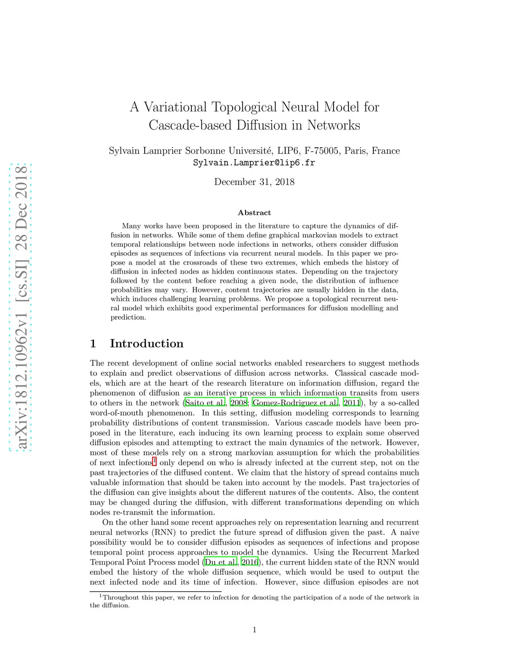 Many works have been proposed in the literature to capture the dynamics of diffusion in networks. While some of them define graphical markovian models to extract temporal relationships between node infections in networks, others consider diffusion episodes as sequences of infections via recurrent neural models. In this paper we propose a model at the crossroads of these two extremes, which embeds the history of diffusion in infected nodes as hidden continuous states. Depending on the trajectory followed by the content before reaching a given node, the distribution of influence probabilities may vary. However, content trajectories are usually hidden in the data, which induces challenging learning problems. We propose a topological recurrent neural model which exhibits good experimental performances for diffusion modelling and prediction.