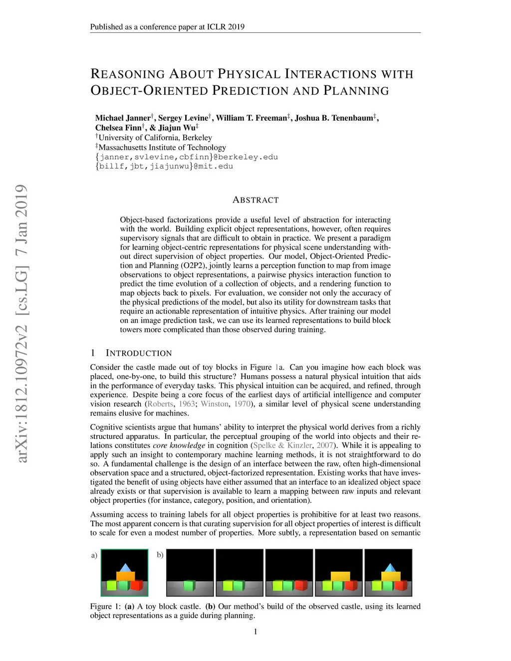 Object-based factorizations provide a useful level of abstraction for interacting with the world. Building explicit object representations, however, often requires supervisory signals that are difficult to obtain in practice. We present a paradigm for learning object-centric representations for physical scene understanding without direct supervision of object properties. Our model, Object-Oriented Prediction and Planning (O2P2), jointly learns a perception function to map from image observations to object representations, a pairwise physics interaction function to predict the time evolution of a collection of objects, and a rendering function to map objects back to pixels. For evaluation, we consider not only the accuracy of the physical predictions of the model, but also its utility for downstream tasks that require an actionable representation of intuitive physics. After training our model on an image prediction task, we can use its learned representations to build block towers more complicated than those observed during training.